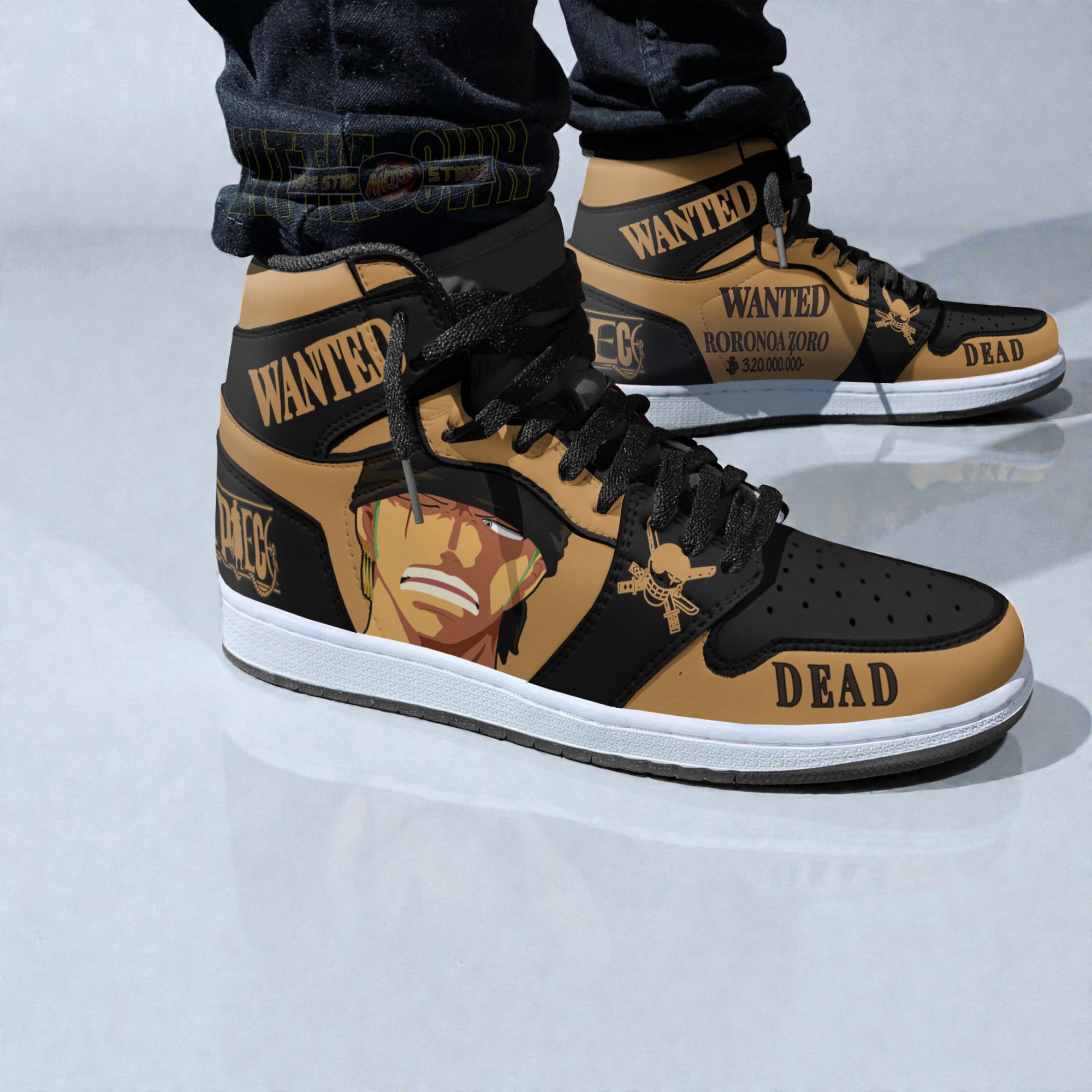 The sharp contrast of deep black against muted tan and crisp white catches the eye immediately, framing a portrait that feels as fierce as it is familiar. The illustrated face of Roronoa Zoro, rendered with bold lines and a hint of grit, commands attention without shouting. Surrounding the character, the blocky, distressed Western-style WANTED typography pulses with a rebellious energy, evoking classic bounty posters while anchoring the shoe firmly in streetwear culture. Subtle skull and crossbones icons nestle into the design, weaving pirate lore into each step. This is more than just footwear—it's a bold expression of identity tailored for those who know the thrill of both adventure and style. Anime enthusiasts who admire the steadfast swordsman will find a connection here, a wearable statement that speaks quietly but confidently to their fandom. Sneaker collectors will appreciate the thoughtful interplay of graphic elements, balanced in a way that honors the intensity of the original character without sacrificing everyday cool. Designed to fit seamlessly into casual scenes—from city pavements to convention floors—the shoe offers a canvas for individuality without demanding the spotlight. It’s a choice for those who embrace their passions in subtle, meaningful ways, able to nod to their favorite story while rooted firmly in the rhythms of daily life. These Roronoa Zoro Wanted Custom Shoes bridge worlds, capturing a spirit of adventure underfoot.Roronoa Zoro Wanted Custom Shoes One Piece Anime Jordan Sneaker Boots