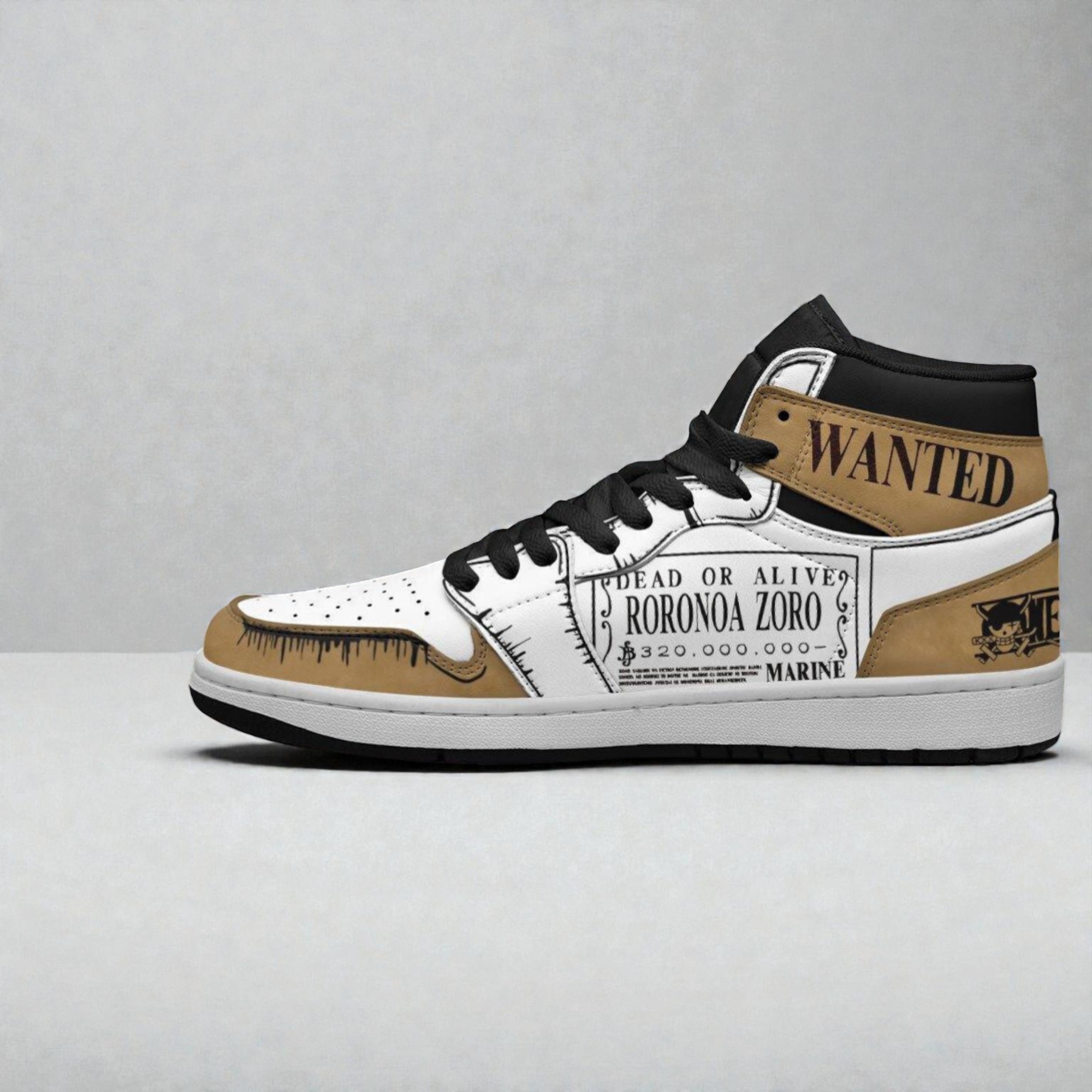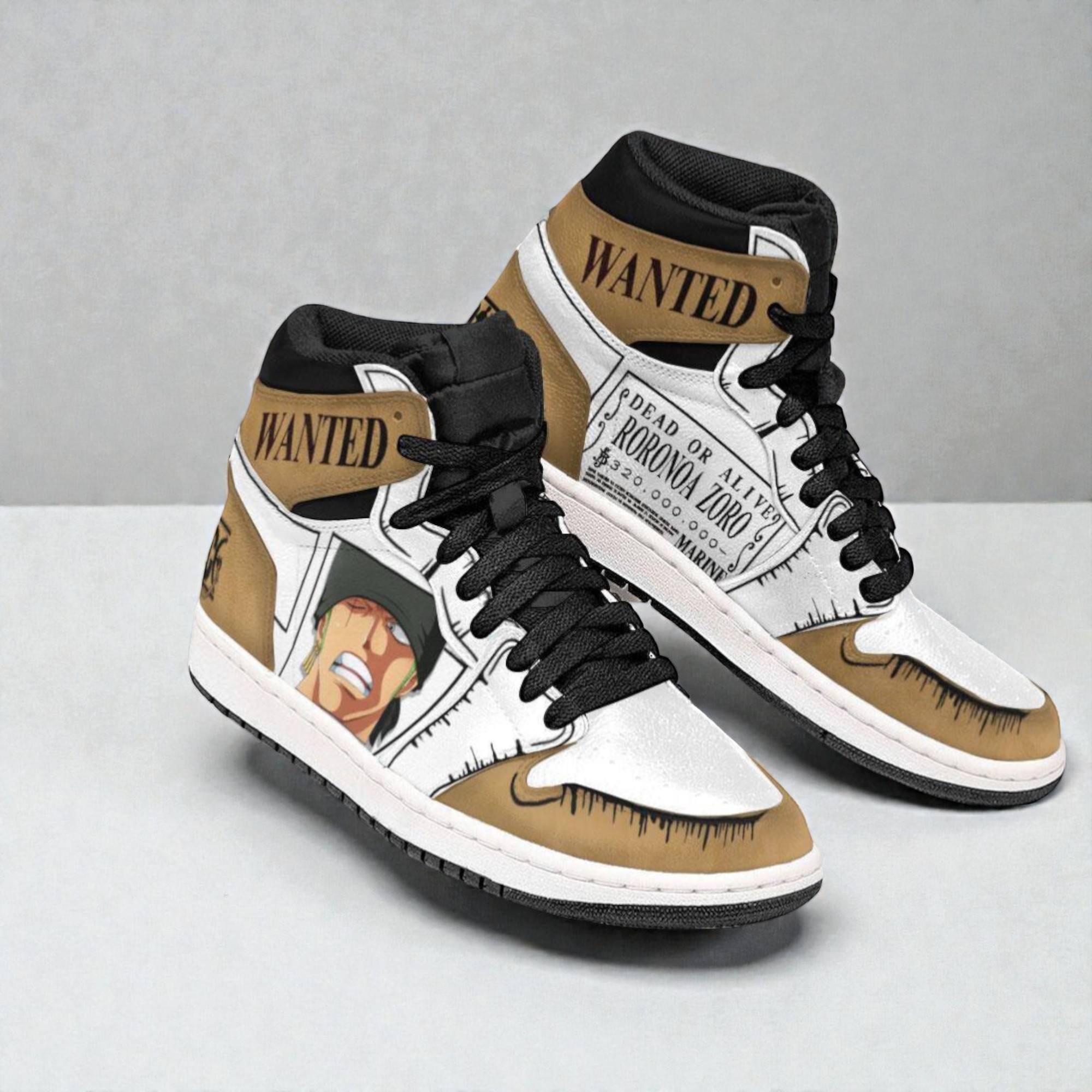 The worn canvas of these boots carries more than just the usual scuffs of daily wear; they shout adventure with every step. A striking “wanted” banner curls above a stylized mugshot—bold serif letters announcing a name synonymous with fierceness and loyalty. Decorative mock currency elements weave through the design, as if stolen pages from a pirate’s ledger were stitched into the fabric. The interplay between sharp graphic lines and a lively handwritten script hints at a personality that defies convention, just like the swordsman hero they celebrate. These Roronoa Zoro sneakers are hardly subtle—they belong to someone who isn’t afraid to wear their passion for One Piece on their feet, whether that’s at a crowded convention or casual hangout where conversation about manga runs deep. The design feels like a natural extension of a fan’s daily rhythm: adventurous, a little rebellious, and unmistakably bold. Pairing these with simple jeans and an oversized tee lets the sneakers claim the spotlight, while an easy jacket rounds out a look that balances function with fandom. They’re the kind of footwear that fits perfectly into someone’s collection—not just for show, but a way to carry around a story and a spirit that’s hard to ignore. Whether it’s a gift for an anime collector or a treat for a manga enthusiast, these are shoes made to move with energy and identity.