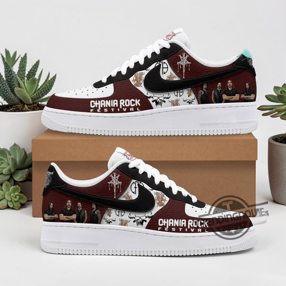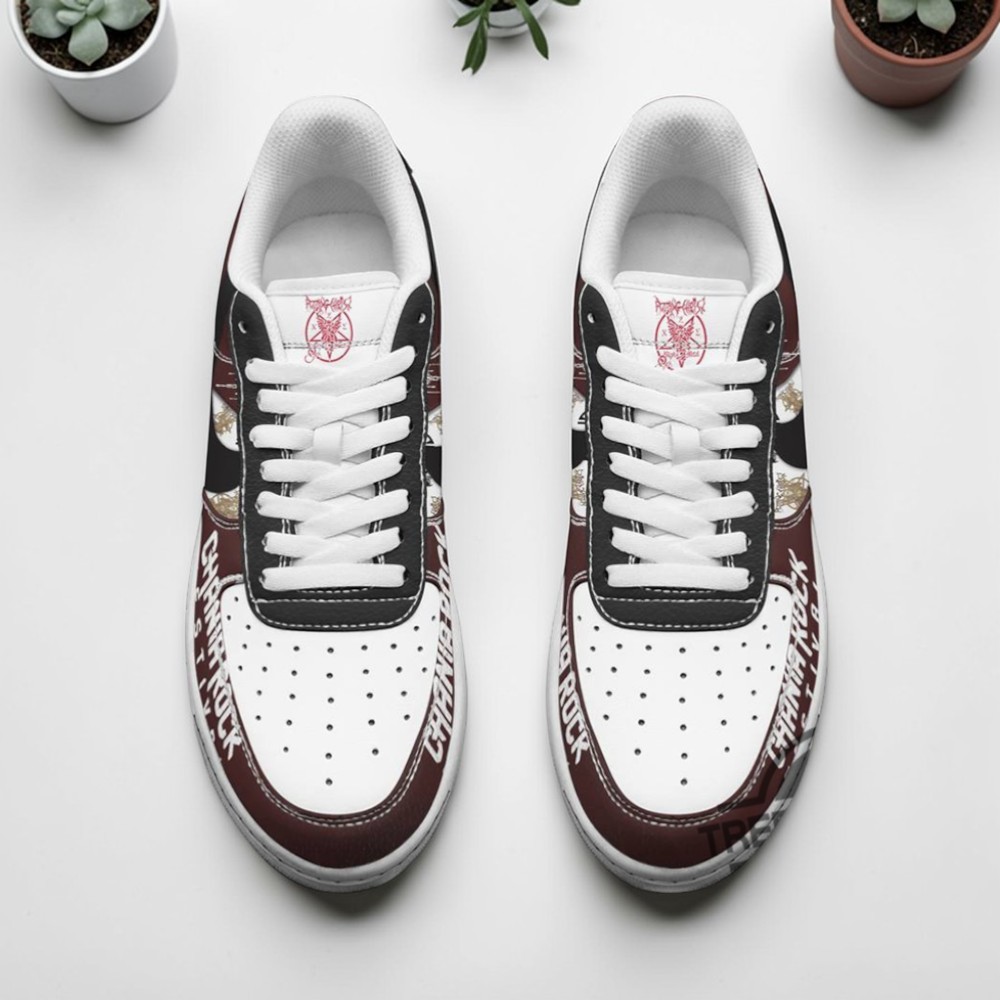 Dark maroon leather stretches across the sleek silhouette, its deep hue interrupted by panels of black lace that veil the sides with an almost fragile intensity. The tongue anchors the gaze, adorned with a stark skeleton emblem—a nod to occult symbolism that speaks plainly to the rebellious spirit of metal culture. White accents ripple through the stitching, sharply contrasting with the textured distressed typography that runs boldly along the edges, recalling retro script styles but with a coarse edge. These shoes don’t just carry a name; they carry a presence. Every detail feels like a deliberate statement. The high-contrast elements and graphic band logos are more than decoration—they convey a raw energy, a refusal to blend into the background. It’s as if the wearer is wrapped in a visual manifesto, declaring allegiance to the fierce intensity of both the music and the lifestyle it fuels. The shoes channel the spirit of the festival grounds where raw sound meets untamed passion, where dark aesthetics collide with vibrant energy. Ideal for those who live and breathe metal, from festival devotees to streetwear enthusiasts who prize bold design, the Rotting Christ Chania Rock Festival Air Force 1 Shoes offer a distinctive edge. They fit seamlessly into late-night gigs and urban wanderings alike, quietly marking the wearer as someone who understands the power of both sound and style interwoven. As a gift, they resonate beyond utility, appealing to those who find identity in the music and the art that surrounds it.