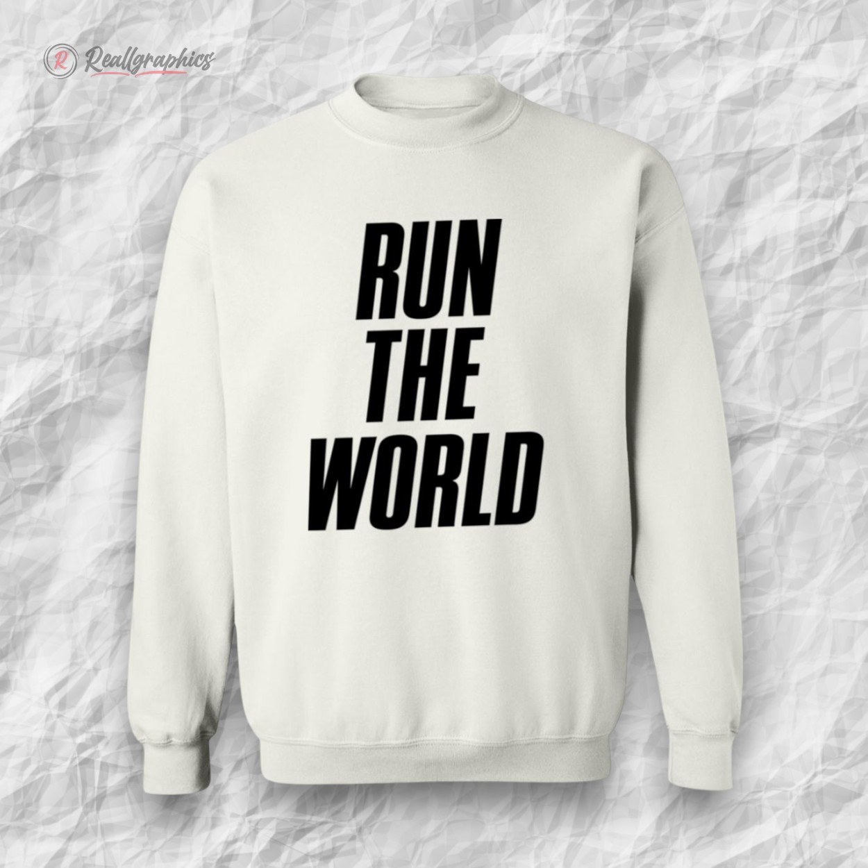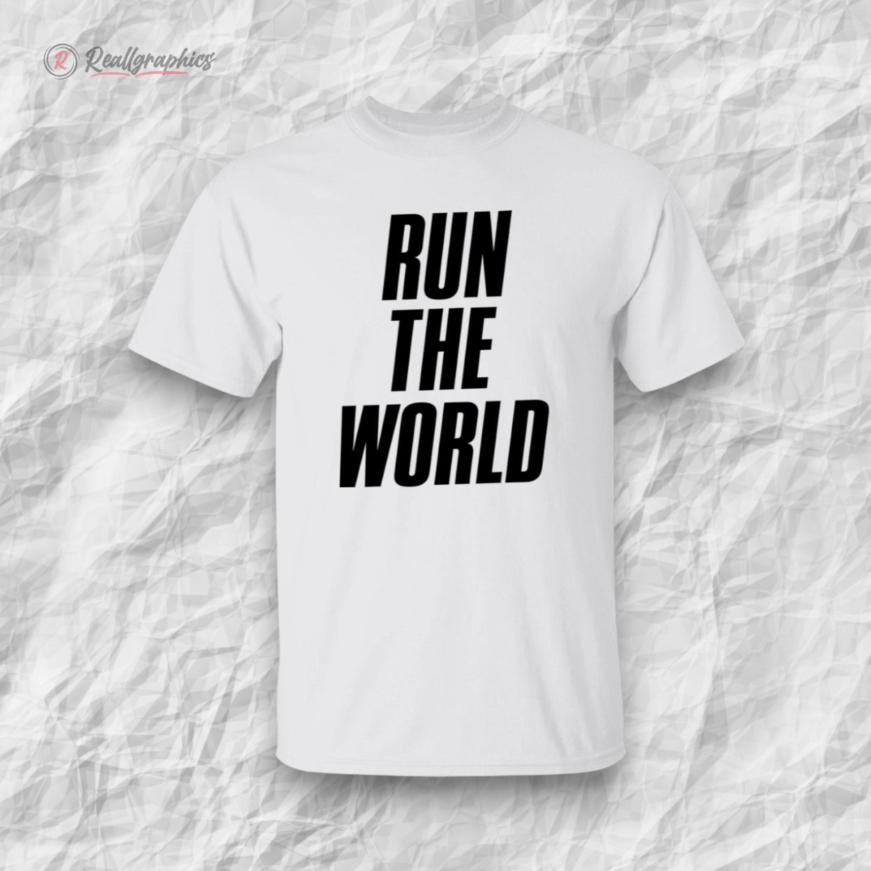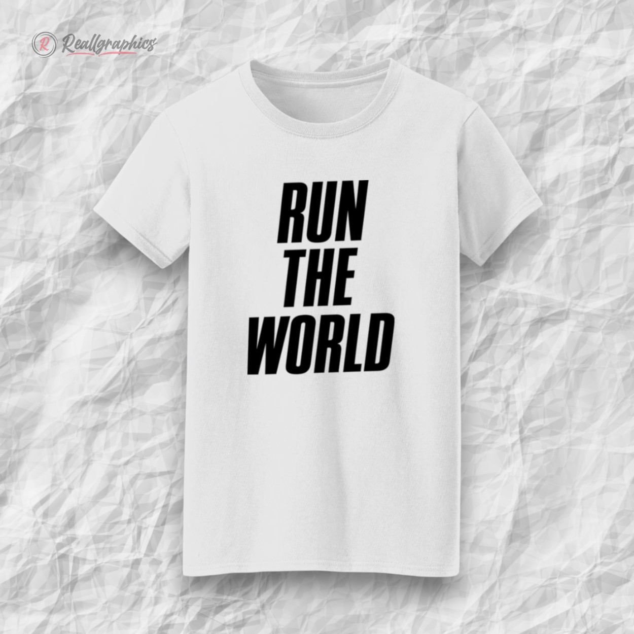 There’s something satisfying about a simple, bold statement you can wear without saying a word. This shirt catches your eye the minute you see it—stark black text stacked neatly on a clean white background. The words Run The World aren’t just printed; they’re designed in a bold, condensed sans-serif font that feels both sharp and strong. The high contrast adds an energy that’s subtle but unmistakable, making the message clear and confident. This piece fits well whether you’re heading to the gym, running errands, or just hanging out. It’s not tied to one gender or style but moves easily with whoever wears it. People who appreciate straightforward motivation, especially those into fitness or chasing big goals, will connect with the vibe. It works as a low-key way to remind yourself—and others—that you’re focused and ready to take on what’s next. It’s also a thoughtful gift for someone who values simple confidence, whether they’re training for a marathon or managing a busy daily routine. The design’s modern athletic feel keeps it casual yet meaningful, making it a go-to for everyday wear without feeling overdone.