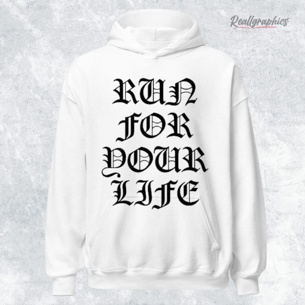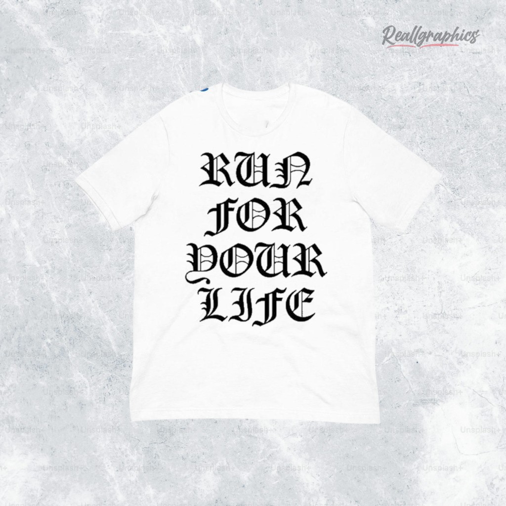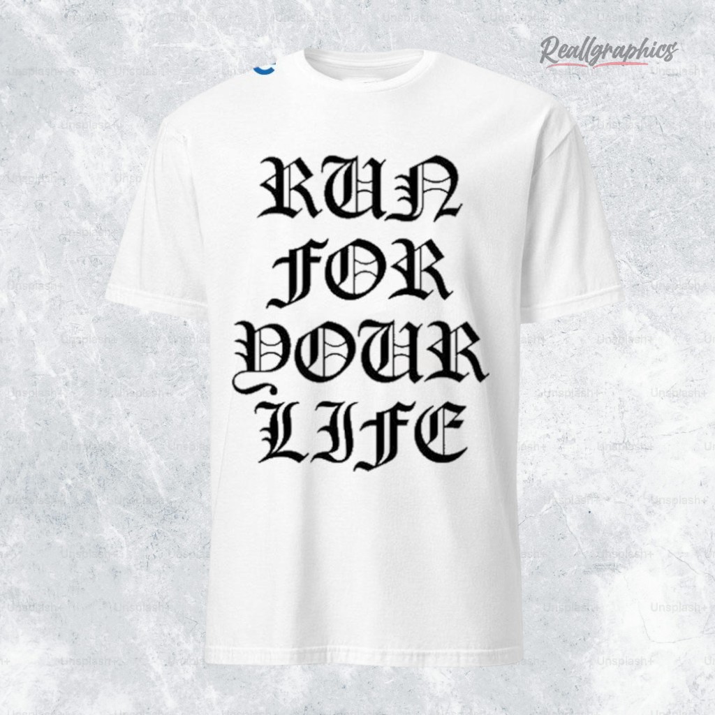 Ever felt like you're in a race against time? This shirt's bold, gothic lettering captures that thrill, reminding you to keep moving forward no matter what. Perfect for those who embrace life's challenges with a dash of humor and a lot of courage. It’s your go-to tee for a dynamic day. Ready to make a statement? Grab yours now and run with it!