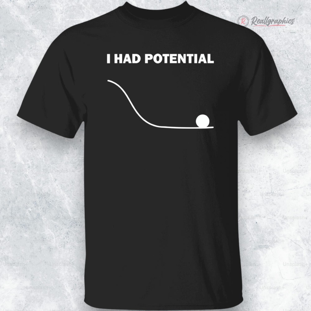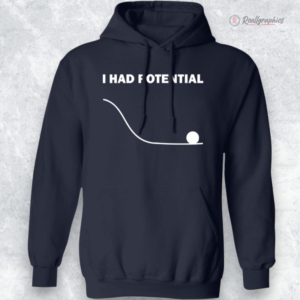 There’s a certain satisfaction in wearing something that quietly speaks your truth without needing explanation. This hoodie nails that feeling with its clever play on identity and ambition. The design features a humorous curve, a minimalist silhouette in bold white against the dark fabric, tracing a simple arc that ends with a small circle—like a visual punchline. Just beneath, blocky sans-serif letters spell out “I HAD F OTENTIAL,” a deliberately offbeat twist on the familiar phrase that’s as sarcastic as it is relatable. It’s the kind of statement that fits perfectly into the wardrobe of someone who likes their self-expression with a side of irony. Whether you’re kicking back with friends, navigating college life, or just hanging out in casual moments, this shirt captures the mood of those who appreciate humor in the face of everyday challenges and aspirations. It’s less about proving anything and more about owning where you’ve been and where you might go, all with a knowing smirk. This piece makes a sharp and thoughtful gift for roommates, classmates, or anyone who’s ever looked back at their own “what could have been” moments without taking it too seriously. The understated graphic and the bold text invite conversation without shouting, making it the kind of wear that blends effortlessly into daily life's quirks while carrying a quietly rebellious edge. For those who resonate with the ironic honesty behind the phrase, the I had potential shirt speaks volumes in a simple, unpretentious way.