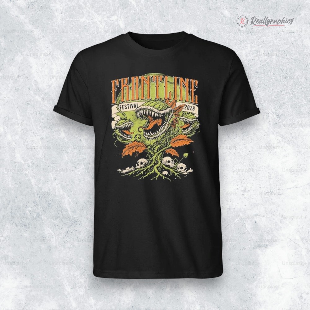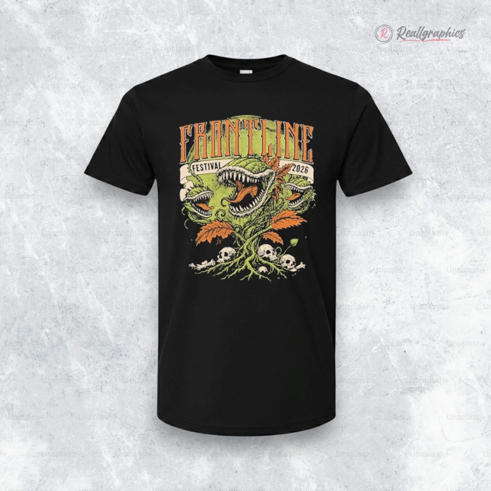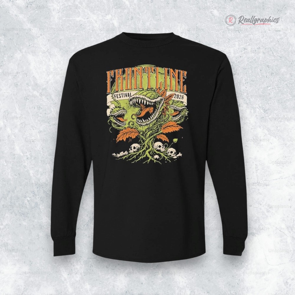The night air hums with an electric edge, where shadows stretch long and city lights flicker with a pulse of restless energy. Against this backdrop, a long sleeve shirt captures that same wild spirit—a dark vintage arcade vibe breathes life into its design. Dominating the front, an illustrated creature—a fusion of dragon and dinosaur—twists through a tangle of plant vines and skulls, its form both menacing and strangely alive, as if it belongs to a world just beyond reality. Above it, a bold banner declares “Festival 2026” in ornate, distressed serif letters, roughened by time yet rising with unmistakable attitude. The lettering’s uppercase style adds weight, like a badge worn by those who thrive in nights filled with music and rebellion. This is no ordinary concert tee; it’s a statement for those who see attending the Frontline Festival not just as a date on a calendar, but as a defining moment—a place where identity and passion intersect. Worn with faded jeans and chunky boots or layered under a well-loved leather jacket, this shirt fits seamlessly into a wardrobe of someone who carries their music fandom beyond the crowd—someone who lives for the thrill of live shows and the stories they tell. It’s the kind of piece that gets passed around among friends who appreciate the raw, unpolished vibe of the festival scene, a subtle nod to shared moments in electric spaces. As a gift, it speaks to those who treasure the soundtrack of their summers, the pulse of anticipation before the first chord strikes. The Frontline Festival 2026 shirt is not just apparel—it’s an emblem of nights owned and memories made.Sable Hills Merch Frontline Festival 2026 At Club Citta Kawasaki On August 29 2026 Shirt