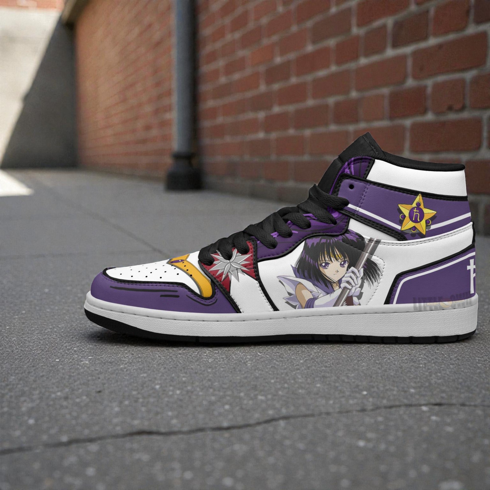 In a world where streetwear often leans toward muted tones or minimalist logos, these sneaker boots draw a sharp line in the sand with their vibrant homage to Sailor Saturn. The interplay between deep purples and stark whites creates a dynamic contrast that immediately catches the eye, while the subtle yellow accents add just enough warmth to prevent the palette from feeling too cold or one-dimensional. The panels of the sneaker are thoughtfully arranged, guiding the gaze in waves that match the energetic pulse of the character they celebrate. Bold black outlines carve out sections like comic book panels, lending the shoes a graphic intensity reminiscent of the classic anime’s storytelling style. What stands out beyond the color scheme is the disciplined restraint in typography—almost none is present, except for the star emblem which anchors the design. This choice shifts the focus squarely onto the artwork itself, letting the character illustration speak volumes without interruption. The placement feels deliberate, balanced between a sense of action and quiet strength, much like the quiet yet powerful energy Sailor Saturn embodies. It’s not just footwear; it’s a wearable narrative for those who know the nuances behind the design—a subtle language among fellow fans and collectors who recognize the symbolism. These sneaker boots suit anyone drawn to eclectic streetwear that boldly embraces fandom identity without feeling costume-like. They bridge the gap between casual wear and cosplay finesse, making them an intriguing pick for weekend outings, anime conventions, or creative meetups. For sneaker collectors, the blend of thematic depth and visual punch offers more than just a display piece—it’s an expression of personality that fits into everyday rhythms while nodding to something bigger. A Sailor Saturn sneaker isn’t just about showing allegiance to a character; it’s about carrying that adventurous, heroic spirit with you wherever your day takes you.