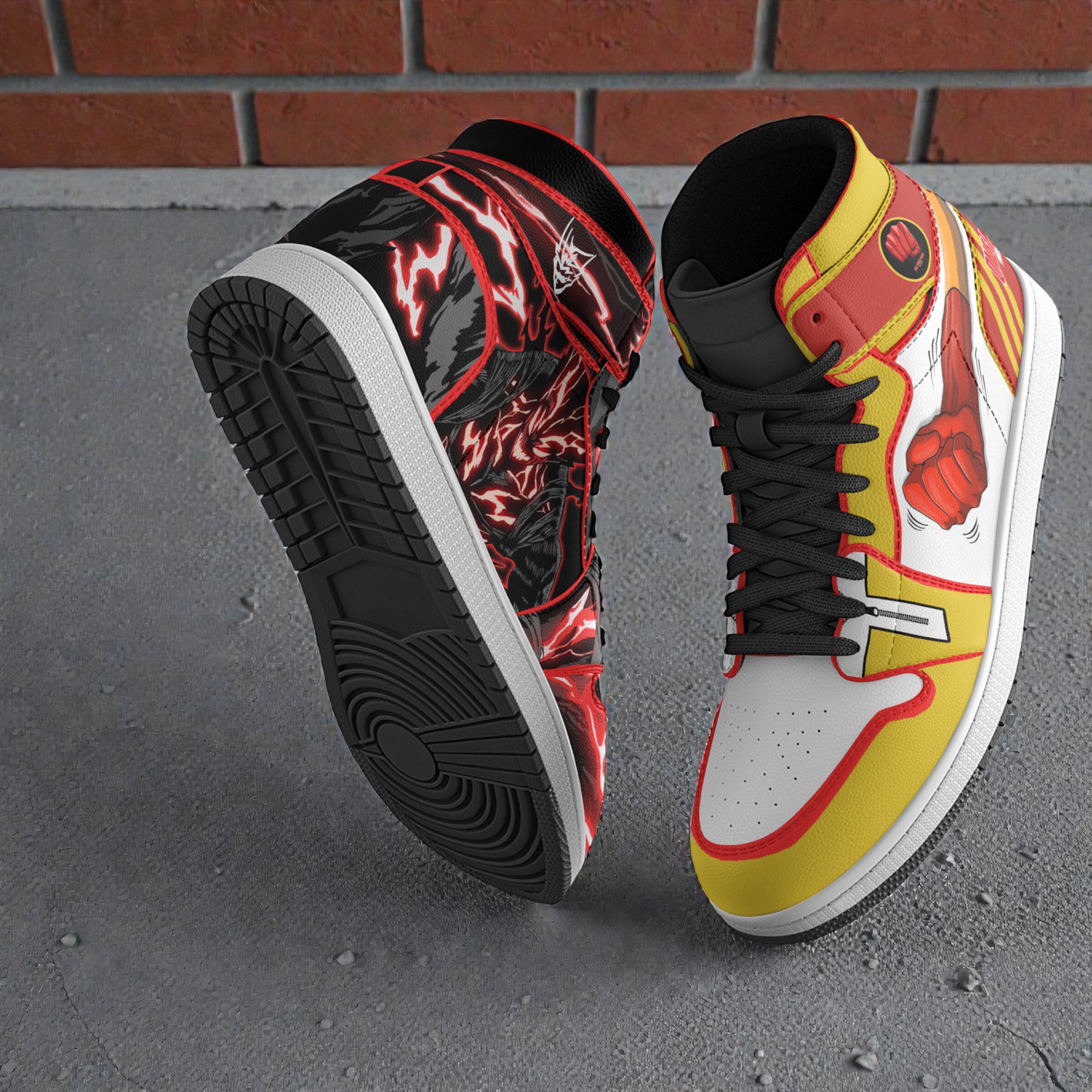 The clash between Saitama and Garou in One Punch Man isn’t just a battle of strength—it’s a showdown of ideals, persistence, and raw energy that fans can instantly recognize. These custom shoes channel that intensity through every detail, giving life to one of anime’s most iconic duos. Bold flashes of red and black dominate the design, with sharp, graphic outlines that mimic the sudden bursts of power these characters unleash. It’s not just footwear; it’s a statement that captures the dynamic tension and action-packed spirit of their confrontations. Each shoe tells a story. One side proudly displays Saitama’s unshakeable calm and blank determination, contrasted by Garou’s fierce expression and fluid motion, charged with lightning-like streaks wrapping around both figures. The interplay between high-contrast white panels and yellow energy bursts electrifies the sneakers, giving them momentum even while standing still. It’s this careful balance of comic-style artistry and bold color blocking that makes the design feel alive. The minimal yet striking typography hints at the serious edge these characters carry, avoiding clutter while emphasizing focus and impact. For sneaker collectors or devoted anime fans, these custom shoes go beyond footwear—they’re a collectible canvas. The craftsmanship celebrates thoughtful design layout, creating wearables that double as conversation starters at conventions or casual meetups. Anyone who finds identity in the fierce spirit of Saitama’s straightforward power or Garou’s relentless challenge will appreciate how these sneakers encapsulate that vibe. These are shoes made to be seen and remembered, perfect for those who live at the intersection of anime culture and streetwear style. Whether as a personal addition or a gift to a fellow One Punch Man enthusiast, these Saitama x Garou custom shoes bring character and energy to every step. They’re for those who want to carry a piece of the anime’s adrenaline-fueled world with them, grounded in style but charged with passion.