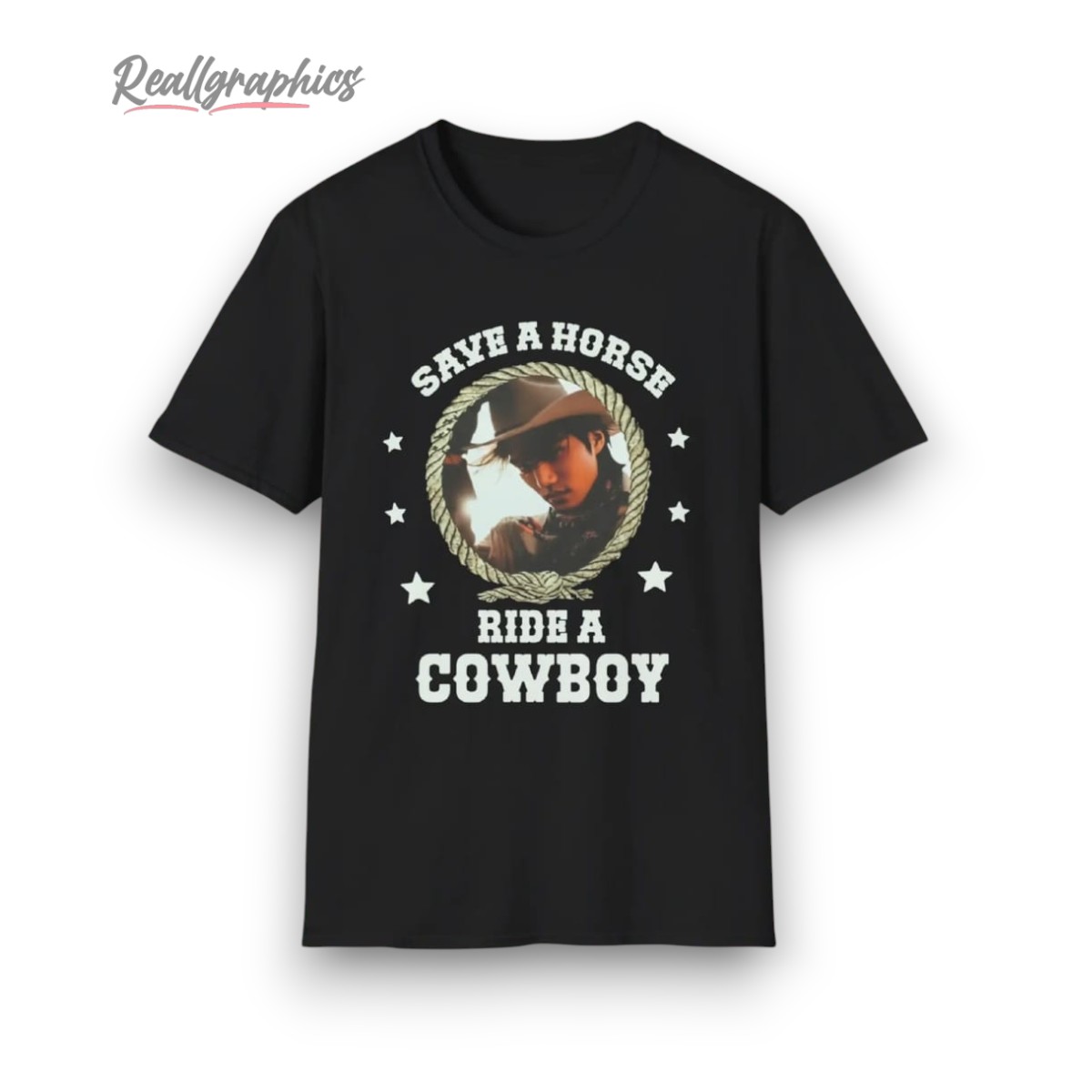 Capture the spirit of adventure with this bold cowboy-themed design. Featuring a striking cowboy portrait framed by a rope and stars, this shirt adds a playful edge to any wardrobe. Perfect for those who love Western vibes and a touch of humor, it's a standout piece that's sure to spark conversations. Ideal for casual outings or themed events, let your style ride high.