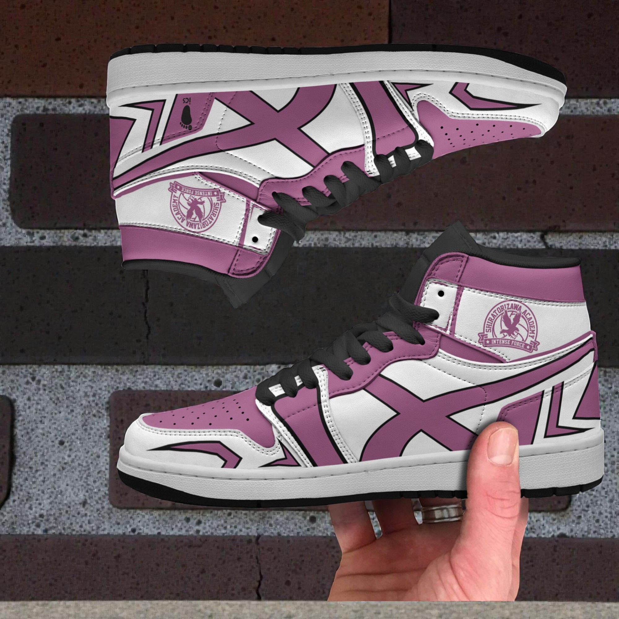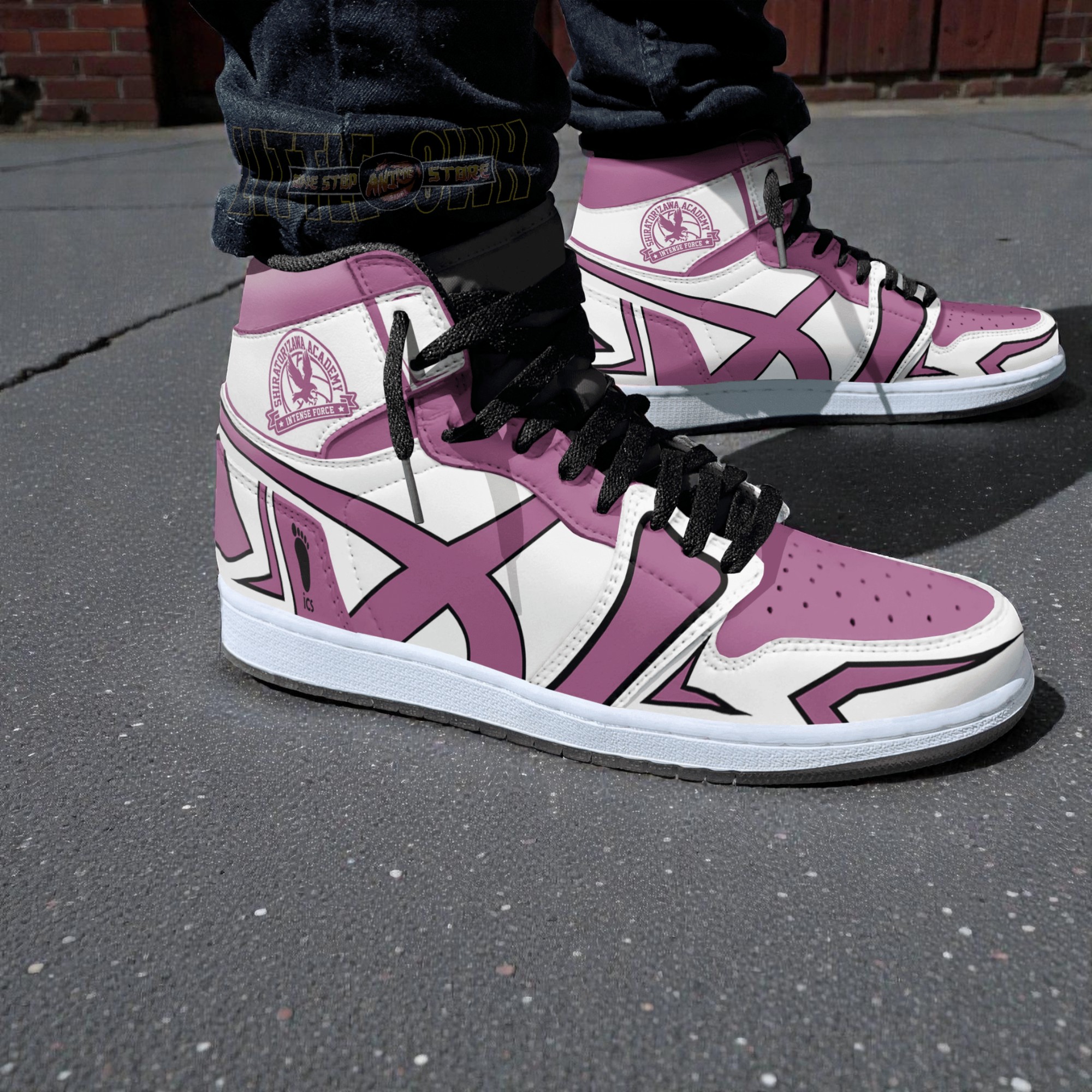A sharp contrast of deep purple and soft pink panels slices across these sneakers, edged by crisp white that accentuates their bold, graphic feel. The cross motifs interlace with the Shiratorizawa Academy emblem, grounding the design directly in Haikyuu’s fiercely competitive world. Black laces tighten the look, adding a sturdy edge that feels both athletic and streetwise. These sneakers capture more than just a visual nod to a beloved team—they channel the spirit of relentless drive that defines Shiratorizawa’s players. Wearing them speaks to a shared identity among anime fans who appreciate the blend of style and substance that Haikyuu delivers. They make a statement not just on the court, but in everyday settings where subtle fandom signals are welcome. Fans who’ve followed the intensity of Shiratorizawa matches will recognize the care put into balancing energetic colors with geometric overlays, reflecting not just the team’s colors but their strategic precision. These Haikyuu Shiratorizawa sneakers resonate with sneaker collectors who seek designs that tell a story, and athletes drawn to sporty aesthetics with a graphic punch. Whether worn casually or brought out for anime gatherings, these shoes find their place in the rhythm of life for those who admire the competition and camaraderie celebrated in the series. They also offer a thoughtful option for gifting—something that honors a shared passion without needing words.