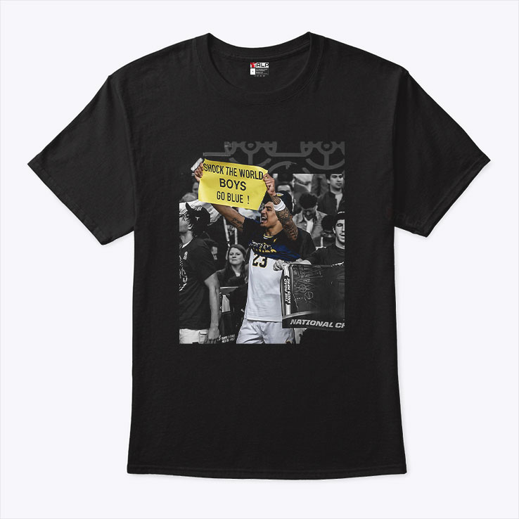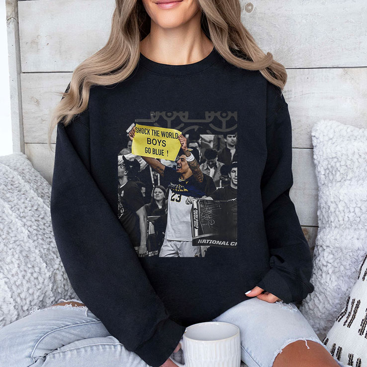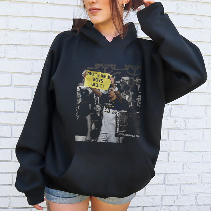 The first thing you notice is that bold yellow banner cutting across the chest, shouting SHOCK THE WORLD. It’s like the shirt captured a heartbeat from a legendary game, frozen in time with that sharp, triumphant energy. Behind the banner, a grayscale image of a pivotal sports moment fades into the black fabric, making the action pop without overwhelming the design. The contrast feels electric, the kind of look that makes you want to stand up and cheer—loud. This shirt isn’t subtle. It’s bold, just like the fans wearing it. The uppercase typography on the banner demands attention, embodying the spirit of Michigan Wolverines supporters who aren’t just watching the game—they’re living it. The black base acts as the perfect canvas, letting every detail—from the grayscale action shot to that vivid yellow text—stand out with clarity and pride. You can imagine this on the shoulders of someone in the stands, braving the cold fall air, wrapped in team loyalty that runs deep. Or handed off as a gift to a die-hard Michigan fan who carries their blue and maize identity everywhere. It’s not just apparel; it’s a statement, a way to say you’re part of something bigger, a tribe that knows how to shock the world. The Shock The World Boys Go Blue Michigan Wolverines Shirt fits right into that lifestyle—game day, tailgate, or just showing off team spirit around town.Shock The World Boys Go Blue Michigan Wolverines Shirt