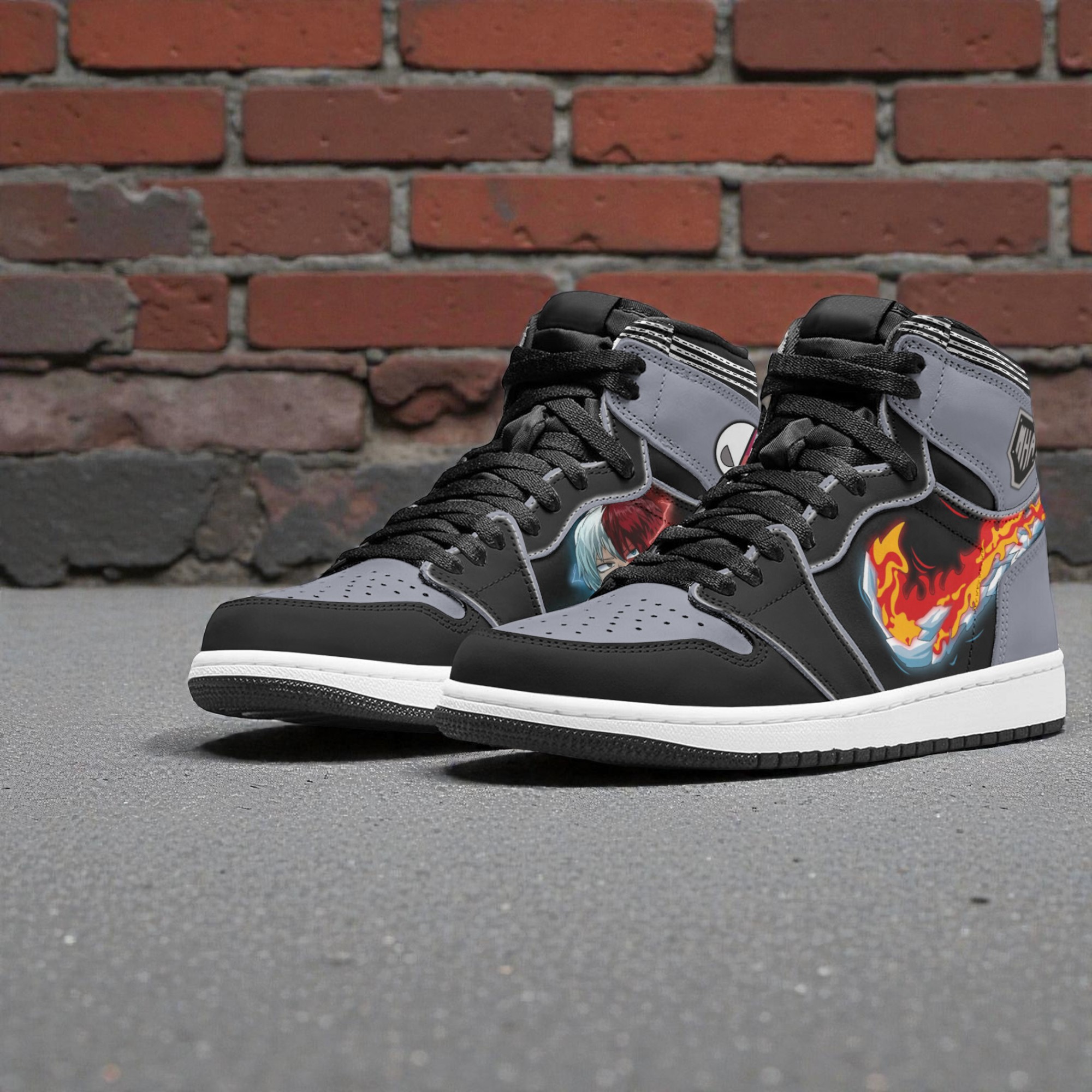 A flicker of orange and red blazes along the side of these high-tops, instantly drawing the eye to the fiery motif that captures the energy of Shoto Todoroki’s dual-element power. The grayscale panels create a striking backdrop, their muted tones offset by contrast stitching that traces the contours with precision. Bold, blocky numbers and initials sit proudly on the tongue and heel, echoing the athletic spirit behind the design. The striped collar adds a subtle nod to classic sportswear, while the logo patches ground the sneaker firmly in the My Hero Academia universe. This sneaker is more than just footwear; it’s a wearable testament to a character defined by duality and strength. Each graphic detail feels purposeful, channeling the heroic, dynamic qualities that anime fans admire. The fusion of futuristic and graphic elements keeps the vibe fresh and energetic—perfect for embracing fandom without sacrificing style. Sneaker collectors seeking a statement piece, cosplayers wanting authenticity in the details, or any My Hero Academia devotee would naturally appreciate the Shoto Sneakers Custom My Hero Academia. They bring a touch of the anime’s intensity into everyday life, whether worn casually, at conventions, or as a standout item in a sneaker rotation. Given its distinctive design and character connection, this is a thoughtful gift for anyone who finds inspiration in heroes with complexity and fire.
