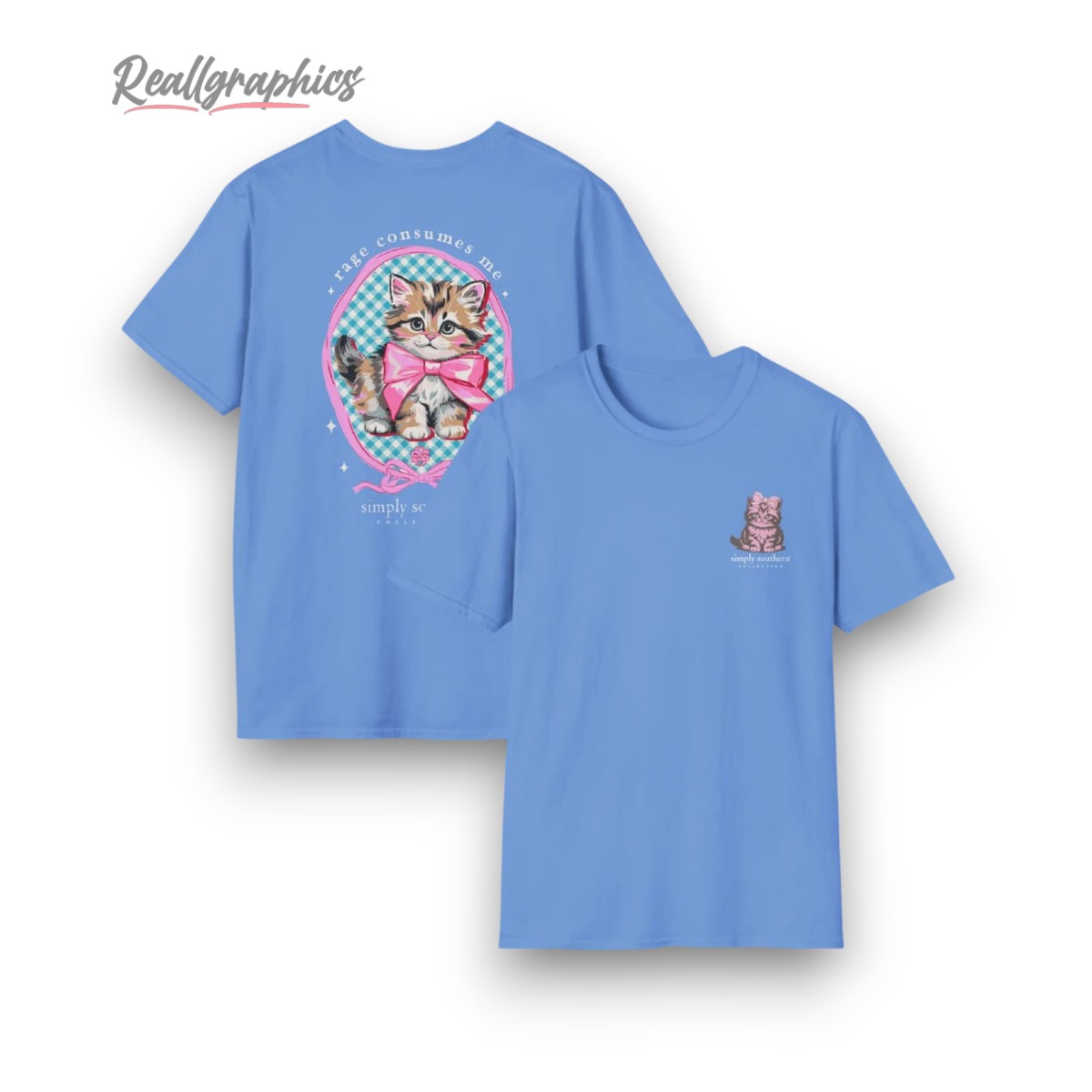 Unleash your playful side with this quirky kitten design! Featuring an adorably fierce cat framed by pastel whimsy and bold text, this shirt is a perfect blend of cuteness and attitude. Ideal for those who appreciate a touch of humor in their wardrobe. Embrace your inner feline with style and let your personality shine.Simply Southern Plus Size Rage Consumes Me Shirt