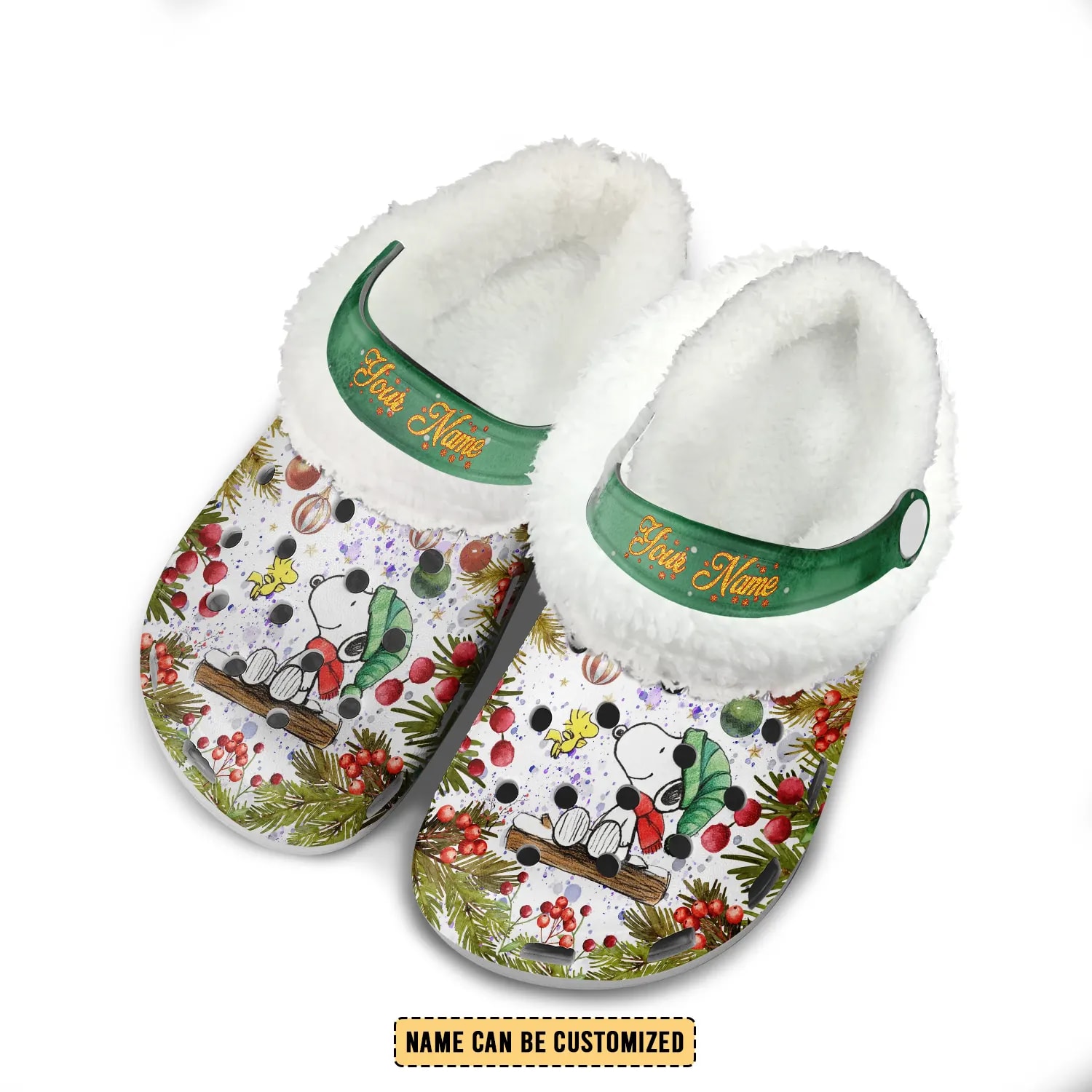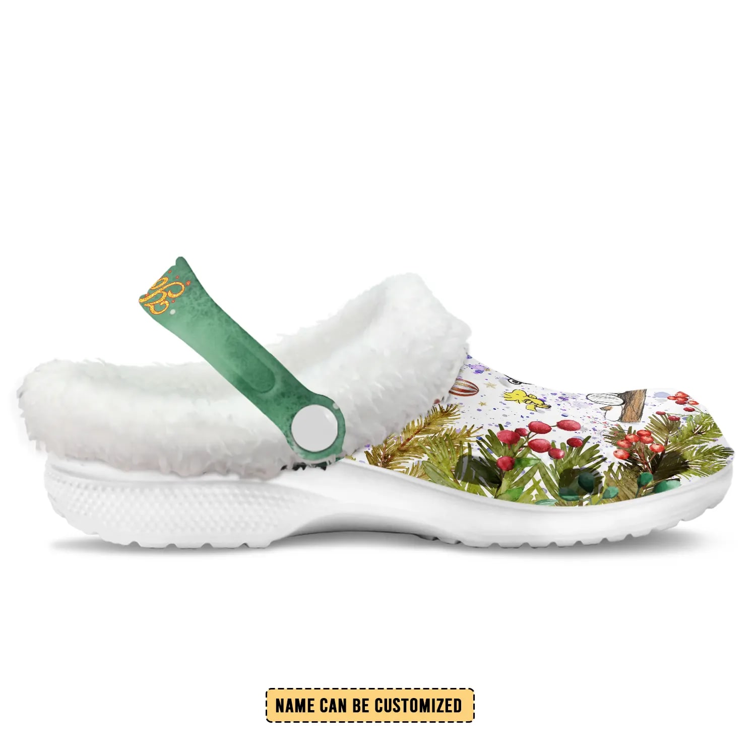 Holiday comfort, the Peanuts way. These fuzzy-lined Crocs feature Snoopy and Woodstock in a festive Christmas design, finished with your custom name on the strap—made for cozy mornings, snowy-season vibes, and gift moments that feel personal.