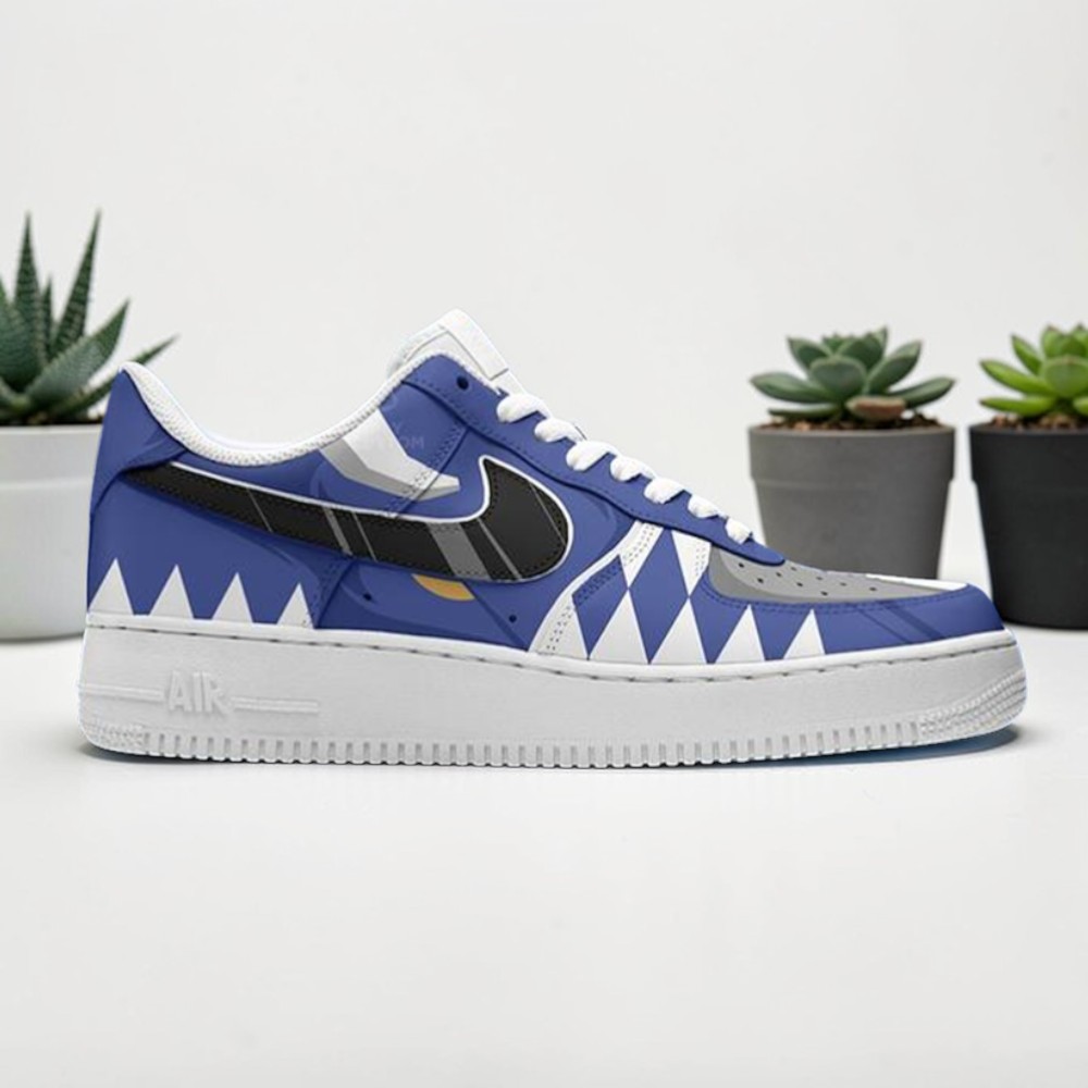 Blue dominates these sneakers with an intensity that echoes the Power Blue Ranger’s fearless energy. The deep blue base is sharply interrupted by a bold black Nike swoosh, creating a striking contrast that draws the eye. White laces run crisp along the top, while a jagged triangular pattern slices through the midsole and toe area—a design nod to the iconic lightning bolts often associated with the series. Light gray accents and a visible air sole unit round out the look, grounding the dynamic design in everyday functionality. This sneaker carries more than just color; it embodies a spirit. The geometric patterns aren’t random—they’re a deliberate throwback to the classic Mighty Morphin Power Rangers era, appealing to those who remember the show as a lively mix of heroism and friendship. It’s a wearable statement for anyone who values boldness and nostalgia, seamlessly blending fandom with an urban sporty vibe. Collectors and enthusiasts will appreciate the attention to detail that goes beyond simple branding. These shoes invite you to express a piece of your identity, a quiet nod to an era that shaped many childhoods or a declaration of current passion for the culture around the Power Rangers legacy. Whether worn on weekend outings or at fan gatherings, the Power Blue Rangers sneaker brings both style and story to the street.
