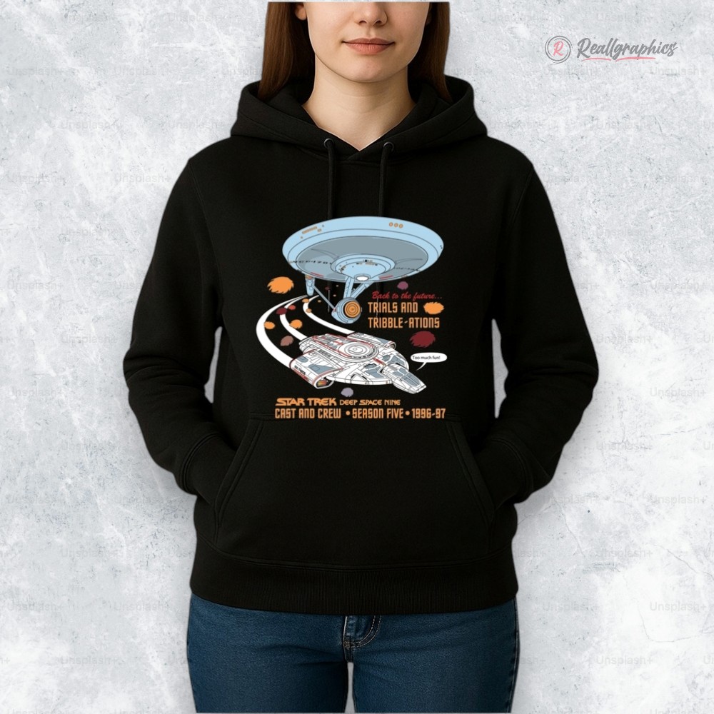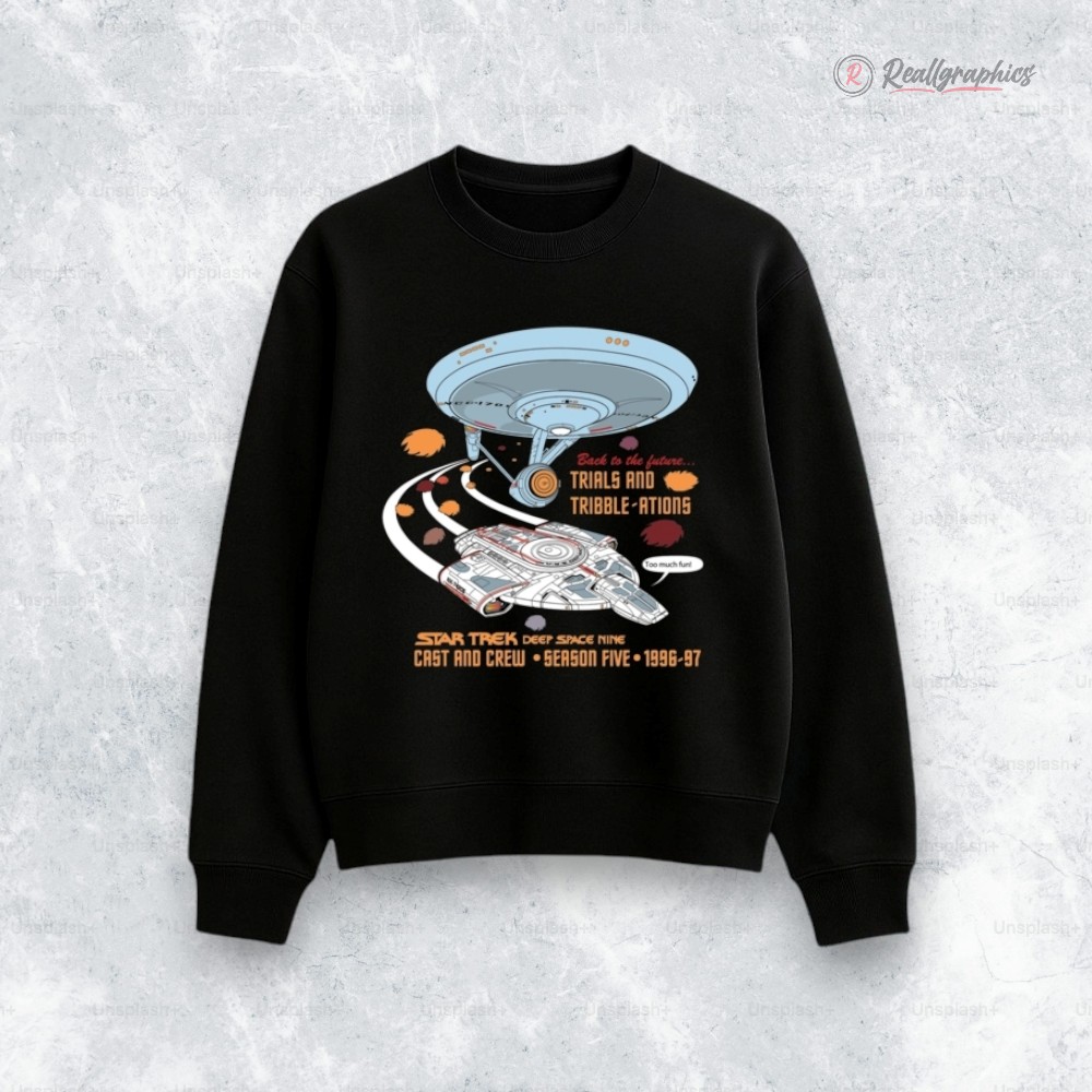 Beam yourself back to 1996-97 with this DS9 Season Five "Trials and Tribble-ations" shirt! Relive the iconic episode where Sisko and the crew travel back in time. A must-have for any Deep Space Nine fan. Get yours now and celebrate this classic episode!