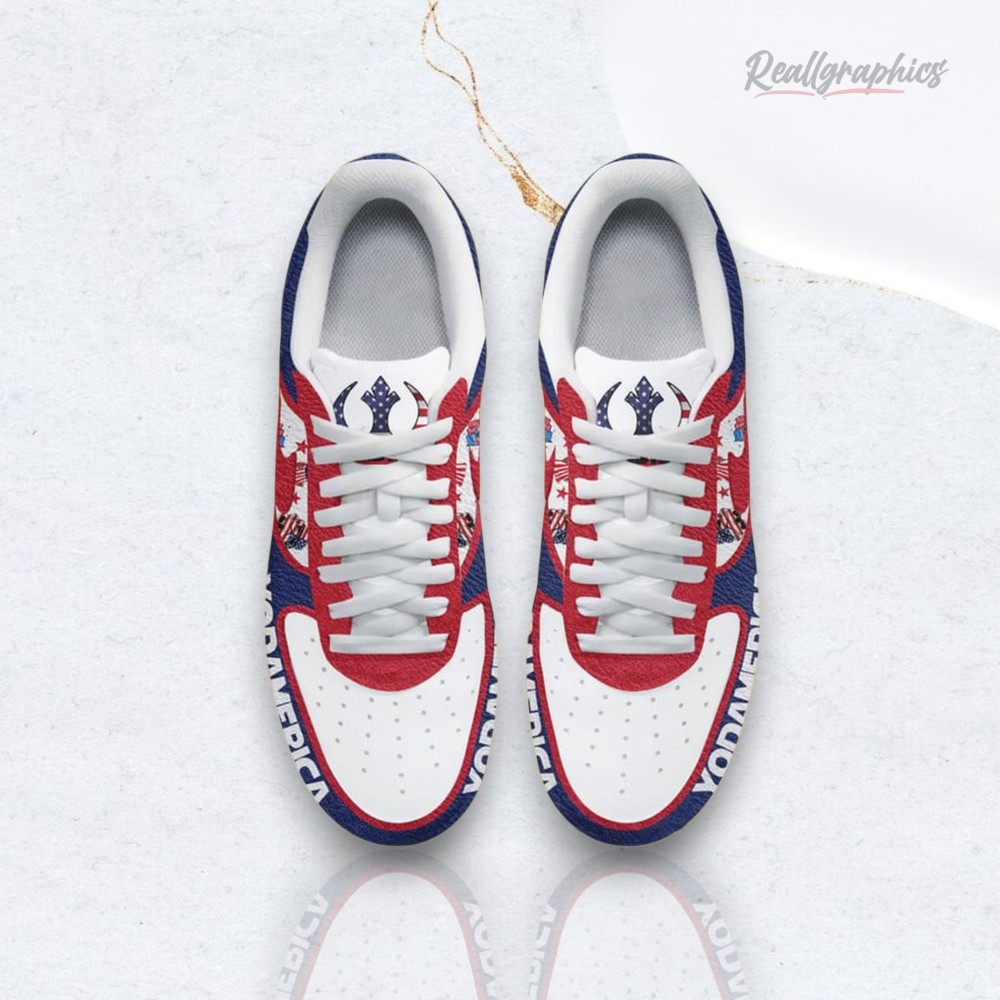 Ever imagined Baby Yoda on a patriotic adventure? These sneakers bring that vision alive with a star-spangled twist, featuring an adorable Baby Yoda alongside the iconic Statue of Liberty. This playful and bold design is perfect for those who love a blend of intergalactic charm and American spirit. Ready to step into a galaxy of style? Grab yours now and let the force be with your feet!Star Wars Movie Baby Yodamerica Liberty Statue AF Sneaker