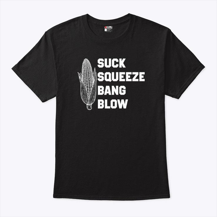 The striking contrast of bold, blocky letters demands attention the moment this shirt enters the room. Crisp white text declaring SUCK SQUEEZE BANG BLOW sprawls across a dark canvas, punctuated by a clean, graphic white corn illustration that adds an unexpected twist to the rebellious slogan. The typography’s condensed, uppercase sans serif style feels unapologetic and raw, paired perfectly with the edgy mood that murmurs humor and provocation without embarrassment. This shirt understands the power of subtle irreverence. It’s designed for those who embrace a sardonic sense of humor and aren’t afraid to broadcast it through their wardrobe. Whether worn out on a casual night with friends or layered beneath a leather jacket for more charged settings, it doubles as a statement piece and a conversation starter. The visual balance between text and image crafts a rhythm on the fabric that feels both deliberate and effortlessly cool. Worn by individuals who thrive on boldness—people comfortable blending wit with attitude—the design complements personalities that appreciate clever, offbeat details. It’s the kind of shirt that suits those who can laugh at themselves and at the world, offering an edge that’s simultaneously smart and accessible. As a gift, it communicates a shared sense of humor without having to say a word, making it a clear pick for anyone who values design that goes beyond the surface. The suck squeeze bang blow shirt stands out not simply because of what it shows, but because of who is drawn to wear it. That confidence is woven into every thread.