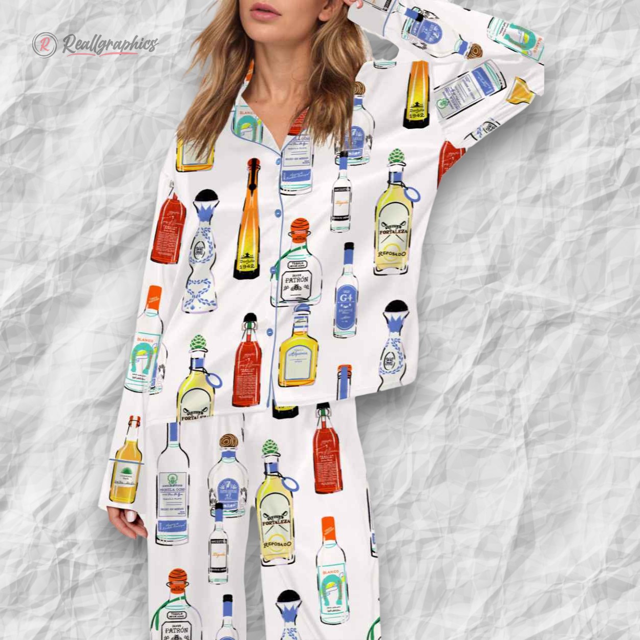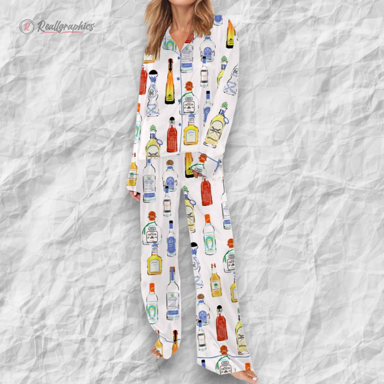 This pajama set is the ultimate nightcap for the tequila connoisseur. Made from a luxurious, silky-smooth satin fabric, it features a vibrant, all-over print of the world's most iconic tequila bottles. From the tall, slender amber bottles to the recognizable blue-and-white ceramic decanters and stout corked glass varieties, this pattern is a "Who's Who" of the liquor cabinet.
