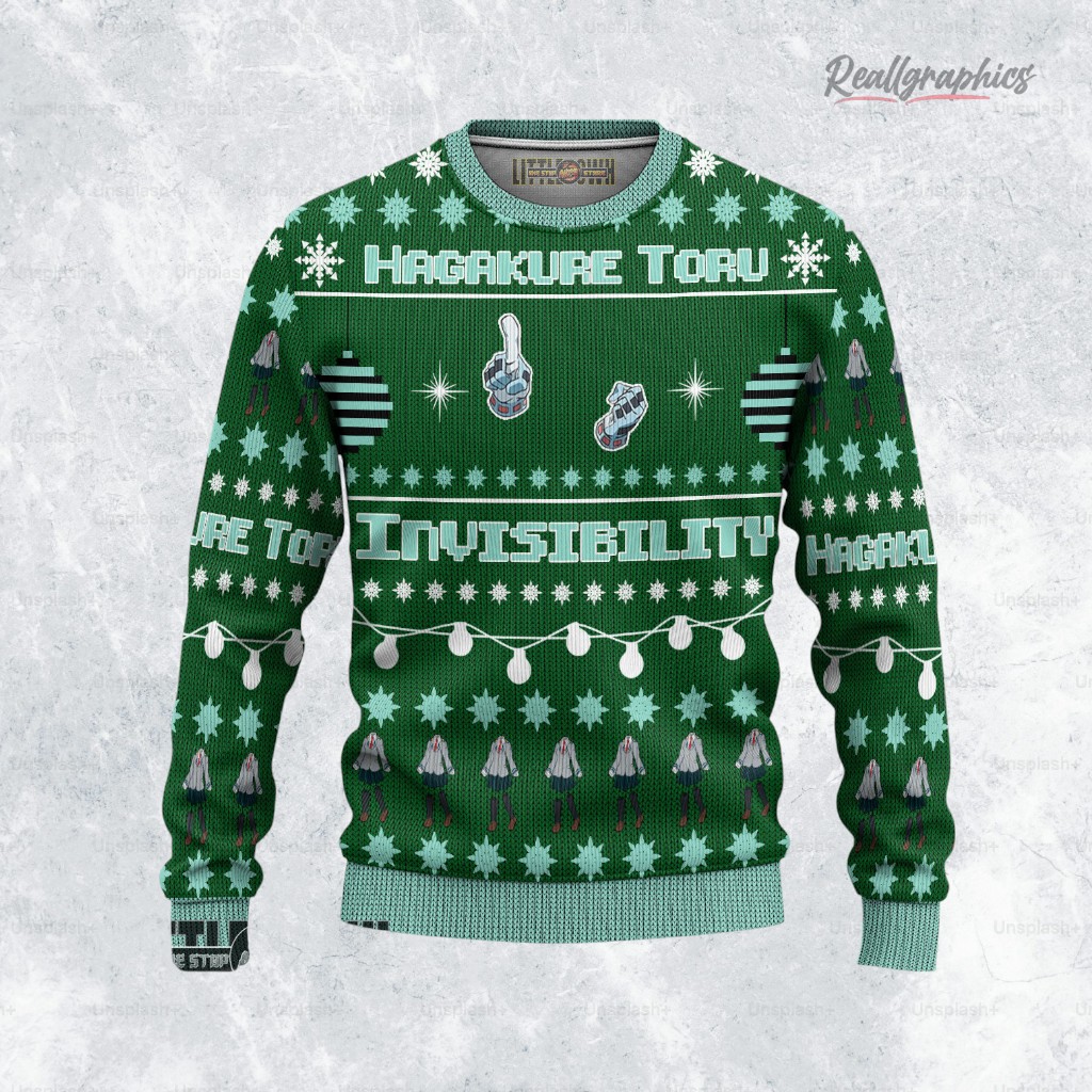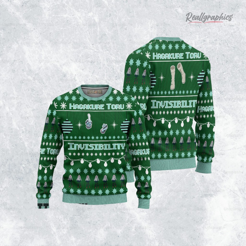 Looking for a truly unique ugly Christmas sweater? Look no further than this invisible hero inspired design! Rock your love for My Hero Academia and spread some holiday cheer (or, you know, invisible cheer) with this quirky sweatshirt. Perfect for holiday parties and anime lovers!