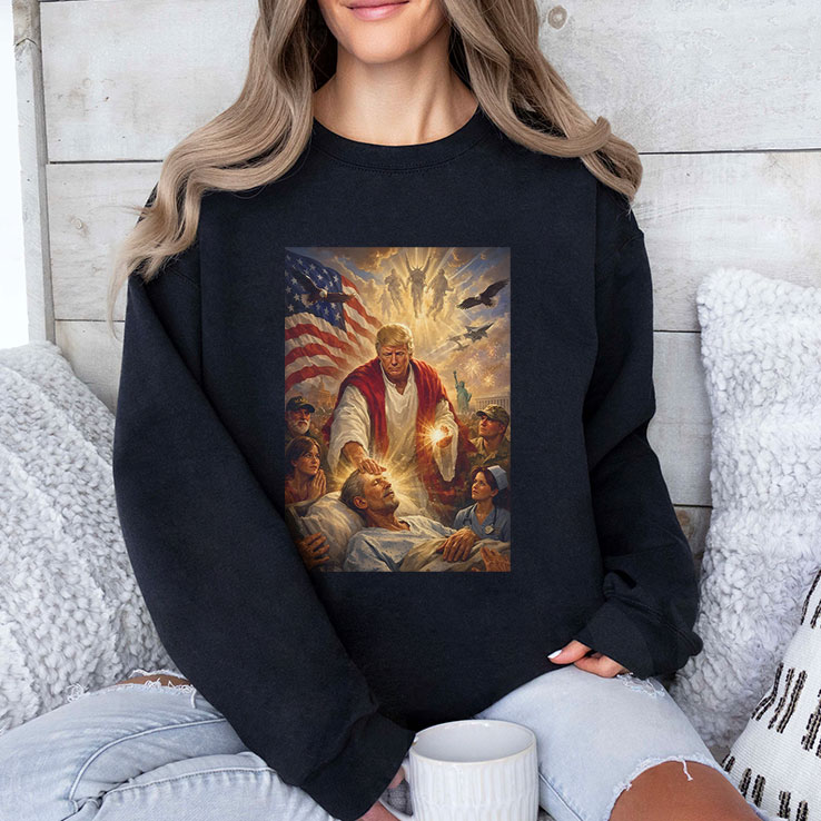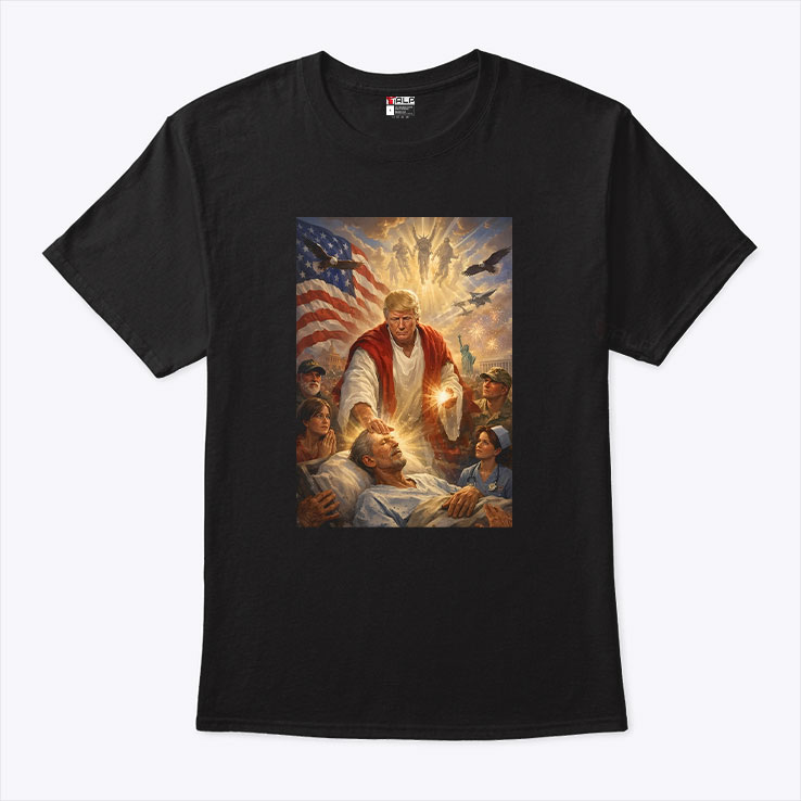 A striking image dominates this shirt—a bold and reverent portrayal of Jesus, standing tall with the American flag billowing behind him like a banner of hope. The light radiates around his figure, illuminating a diverse crowd gathered around a hospital bed, a scene charged with emotion and resilience. Soldiers and civilians alike anchor the composition beneath a dramatic sky, blending elements of faith, patriotism, and heroic compassion into one powerful tableau. The design captures not just a likeness, but a statement—blurring lines between spiritual devotion and cultural identity in a way that feels deeply intentional. It's a conversation starter, a declaration wrapped up in art that feels larger than a moment or a movement. The use of light and shadow creates depth, while every figure tells a part of the story, inviting the wearer to embody a bold spirit of conviction. Careful craftsmanship shows in the layout, where every detail is meticulously balanced. The heroic pose merges seamlessly with the fluttering flag, making the shirt stand out without overwhelming. Colors are rich but measured, giving the design a dramatic yet grounded presence that works well whether worn to a gathering, a patriotic event, or simply as a statement piece for everyday wear. This shirt appeals to those who find strength in both faith and country, perhaps someone who appreciates devotional art with a modern edge. It’s a thoughtful gift for anyone who lives at the intersection of religious imagery and patriotic pride, perfect for sharing a powerful symbol that resonates beyond words. The Trump Jesus Christ shirt doesn’t just cover fabric—it carries conviction.