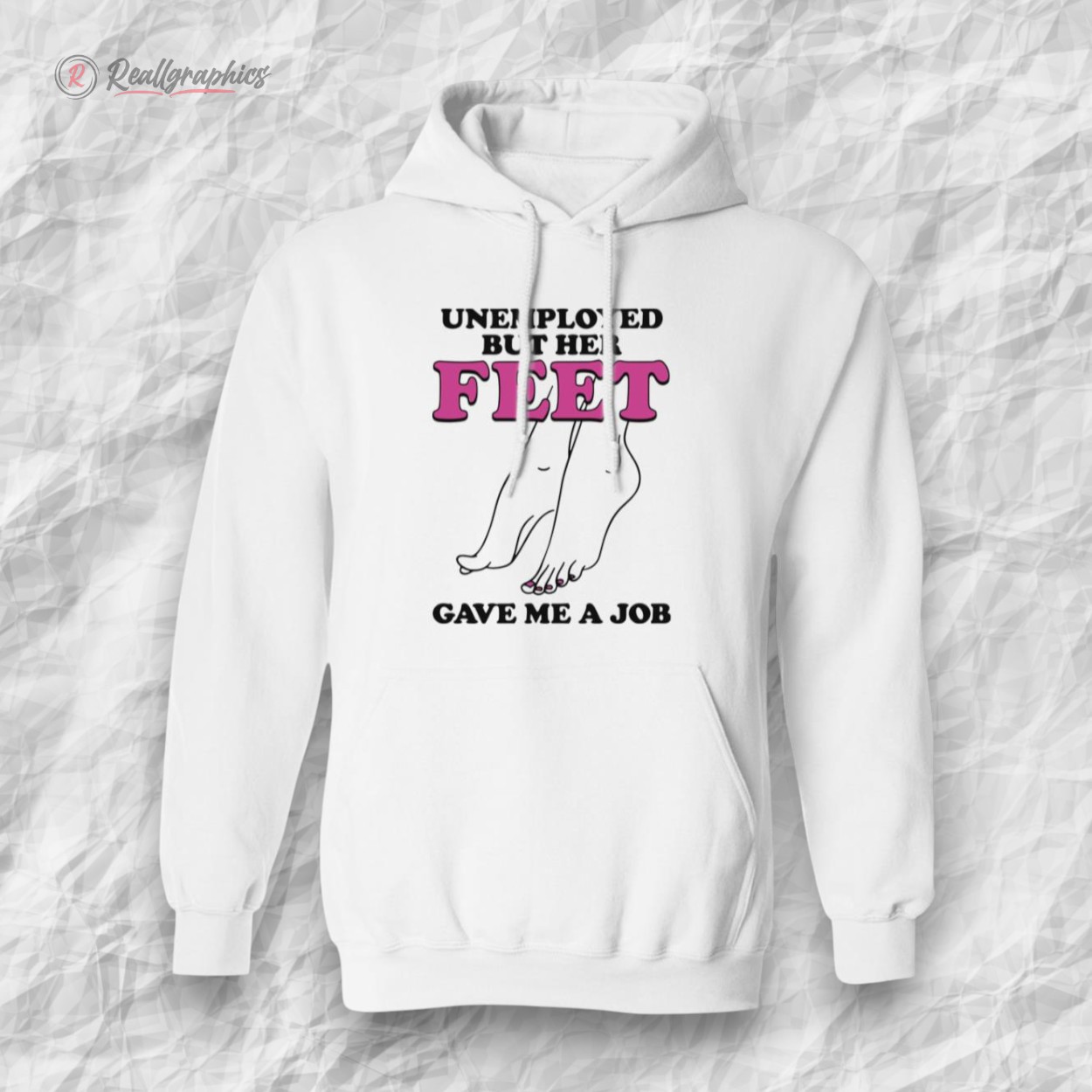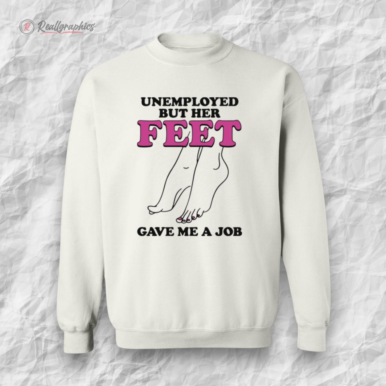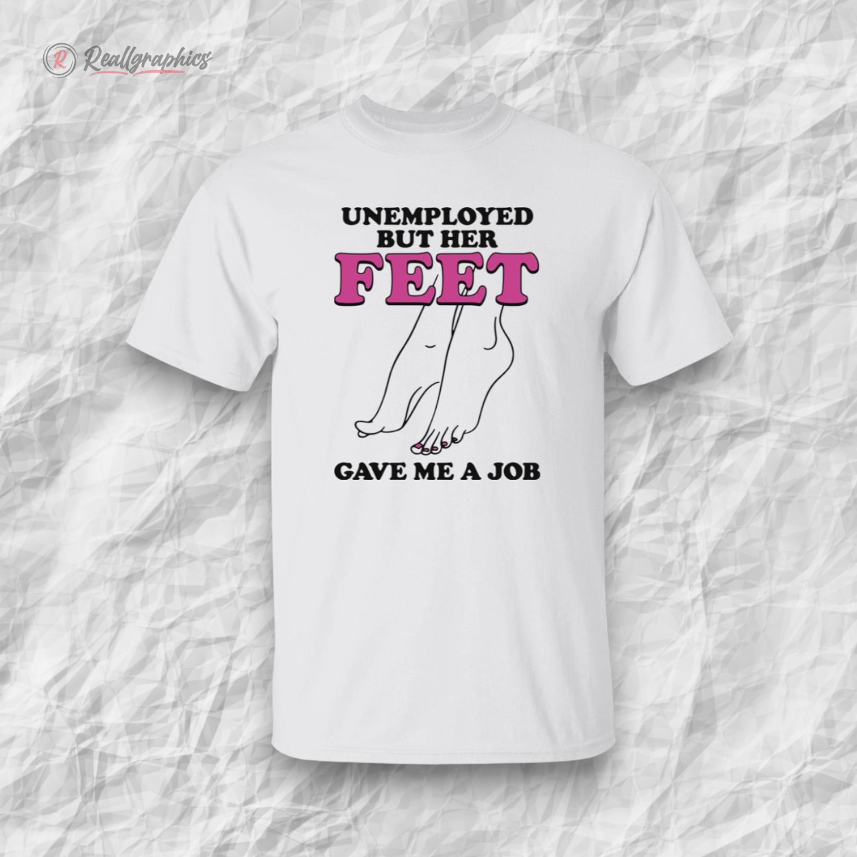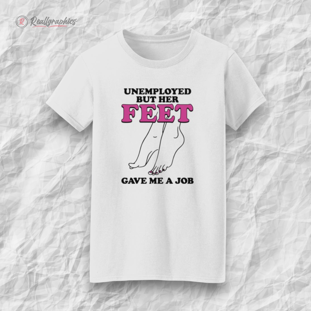 The shirt catches your eye with its bold retro flair—a cheeky pair of feet drawn in simple black lines anchors the design, while chunky pink letters spell out F I E T right across them. Above and below, the words “Unemployed But Her” and “Gave Me A Job” stack in sharply contrasting black typography, creating a playful push and pull between color and form. The way the letters are arranged demands attention without overwhelming, striking a balance that gives the design both attitude and clarity. This is a piece that speaks directly to anyone who’s ever found humor in life’s ironic twists. It fits right into the culture of playful banter and self-aware sass, where embracing quirks is part of personal style. Whether it’s the kind of inside joke you share with close friends or a bold statement to wear out loud at casual gatherings, the shirt becomes more than just fabric—it's a snapshot of personality, a wink to those who get it. Ideal for someone with a mischievous sense of humor or as a gift to a friend or sibling who thrives on that offbeat charm, this design isn’t just about laughs. It carries a certain grounding pride, a way to slip into something comfortable and familiar during laid-back moments, where comfort meets attitude in everyday wear. The unemployable feet have never looked so good.