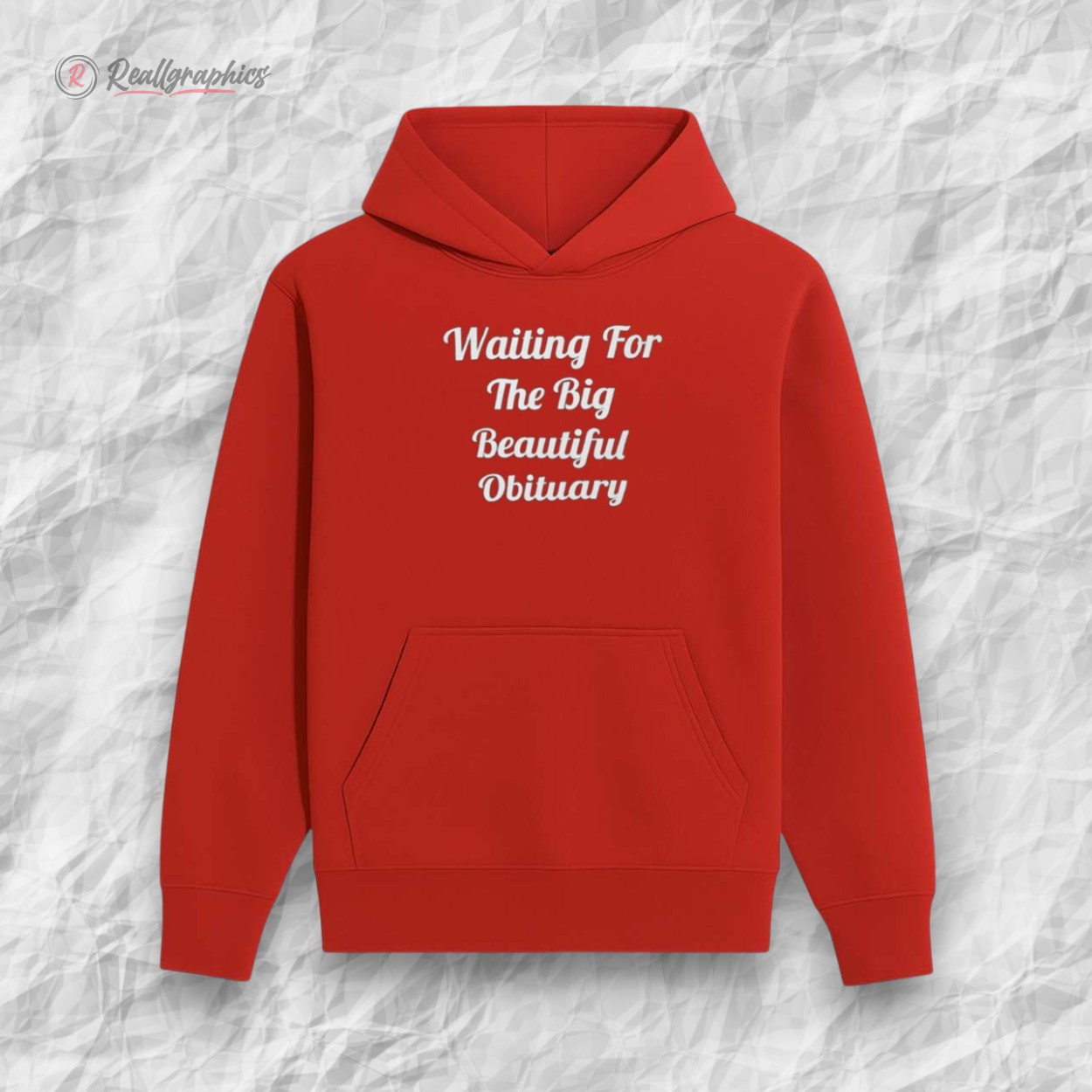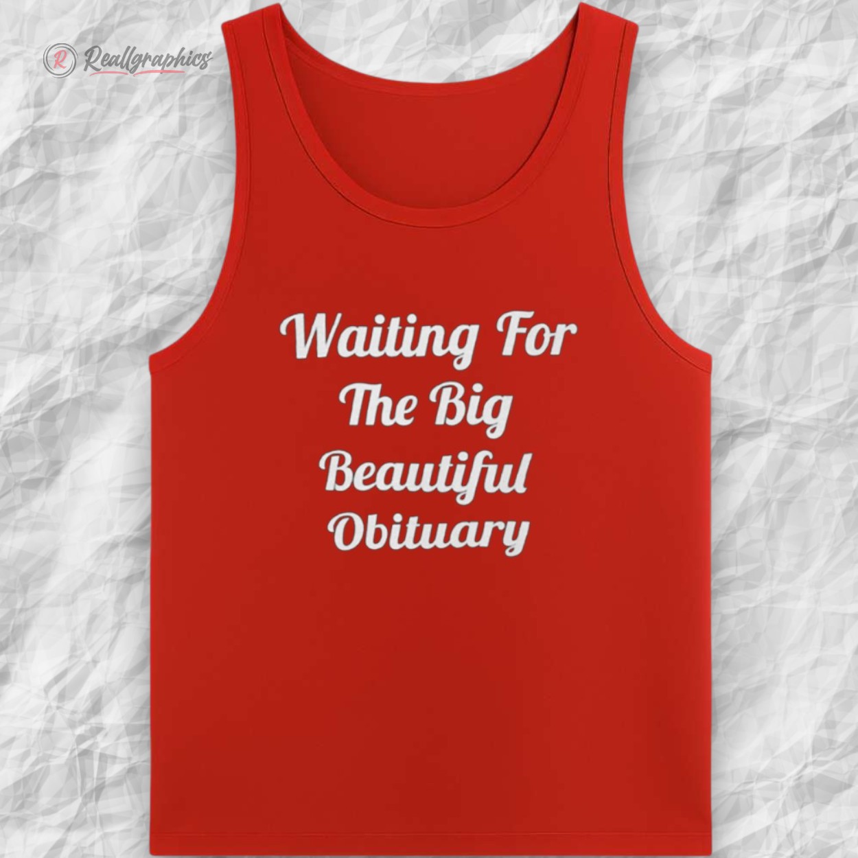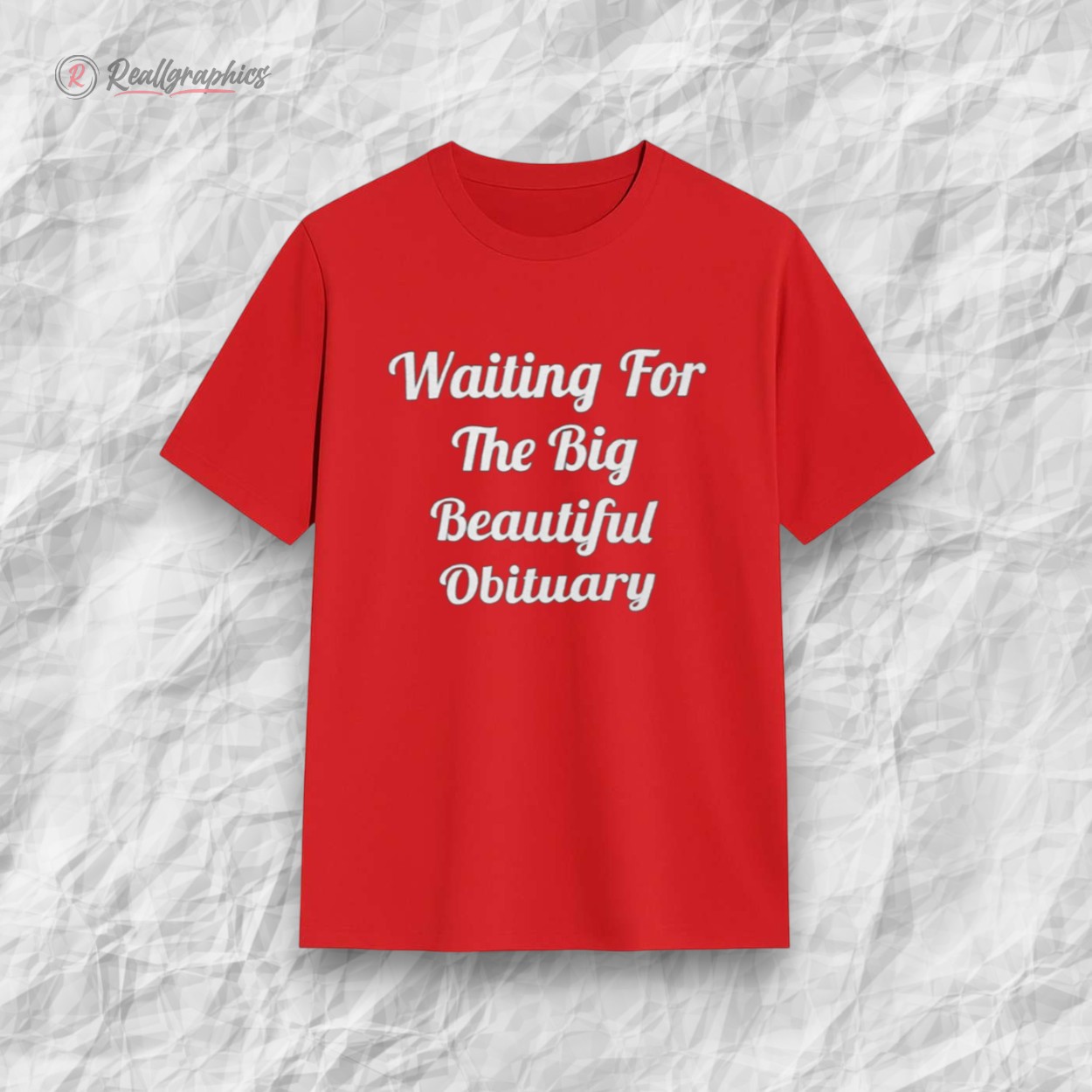 This shirt is for anyone who appreciates dark humor and sharp wit. The design features the phrase "Waiting For The Big Beautiful Obituary" in a classic white font, standing out clearly against the background. It is a sarcastic, edgy statement piece that fits perfectly with a bold personality.