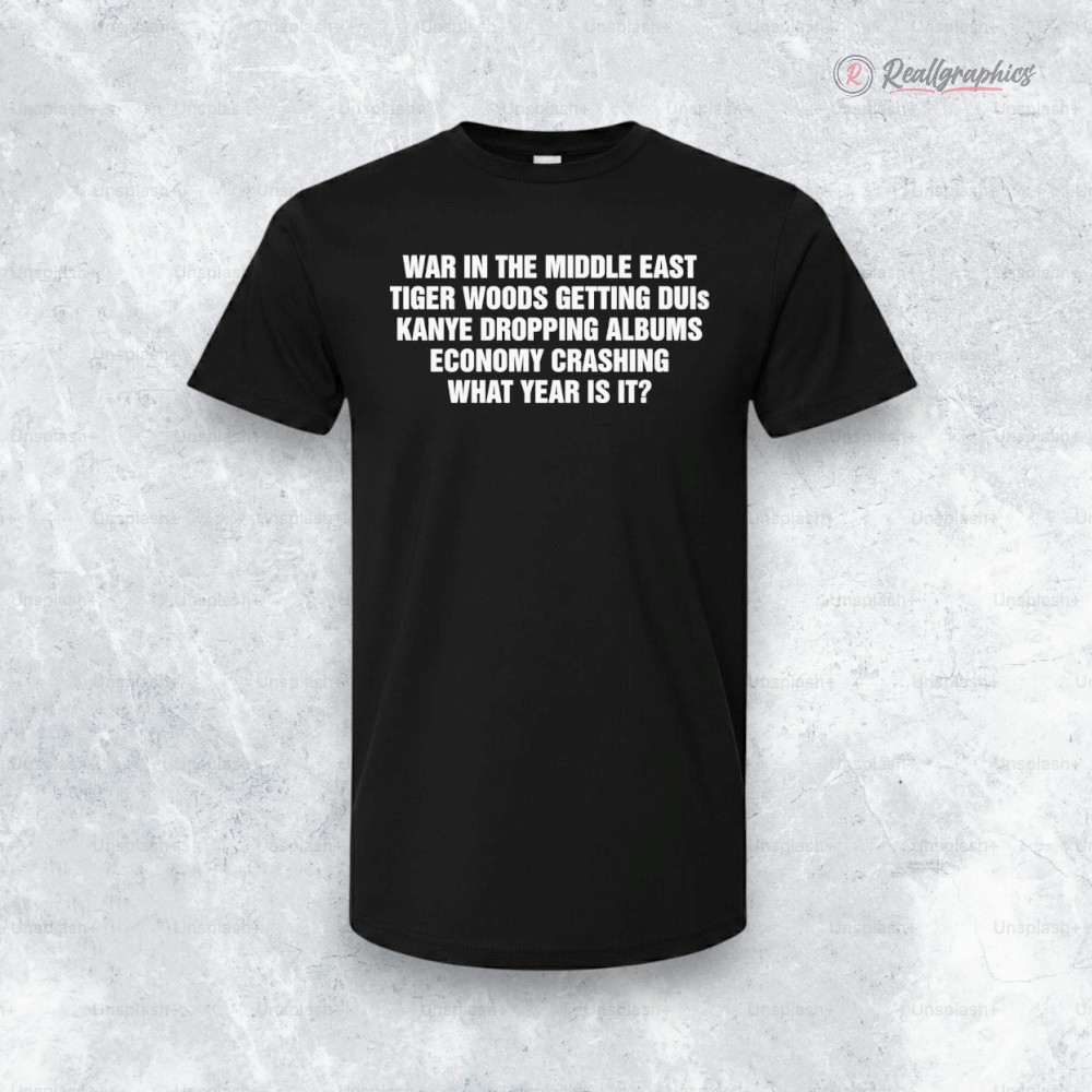 The way someone dresses often speaks as much about them as the conversations they have. A shirt with a bold, block-style statement takes on a voice of its own—one that’s sharp, ironic, and unapologetically loud. This particular design uses heavy, condensed white typography set against a solid black background, stacking phrases in all caps to create a visually arresting block of text. The words are arranged tightly, commanding attention without any need for embellishment or color beyond stark contrast. It’s the kind of shirt that signals a certain edge, a willingness to engage with the chaos and contradictions of current events through humor. Those who enjoy satirical reflections on politics and pop culture—especially younger adults who move fluidly between meme culture and social commentary—will find this shirt aligns with their vibe. It’s not just about making a statement; it’s about wearing something that feels like an extension of a conversational mindset that’s both aware and irreverent. In everyday life, this shirt fits seamlessly into casual settings, whether it’s hanging out with friends who appreciate edgy humor or sparking discussions online. For anyone tracking world news with a critical eye but refusing to take it too seriously, it’s a way to express that complex blend of frustration and wit. The “war in the middle east shirt” label might summarize its appeal, but the real draw is how it wears like a personal commentary—raw, unfiltered, and distinct.War In The Middle East. Tiger Getting Duis. Economy Crashing. What Year Is It Shirt
