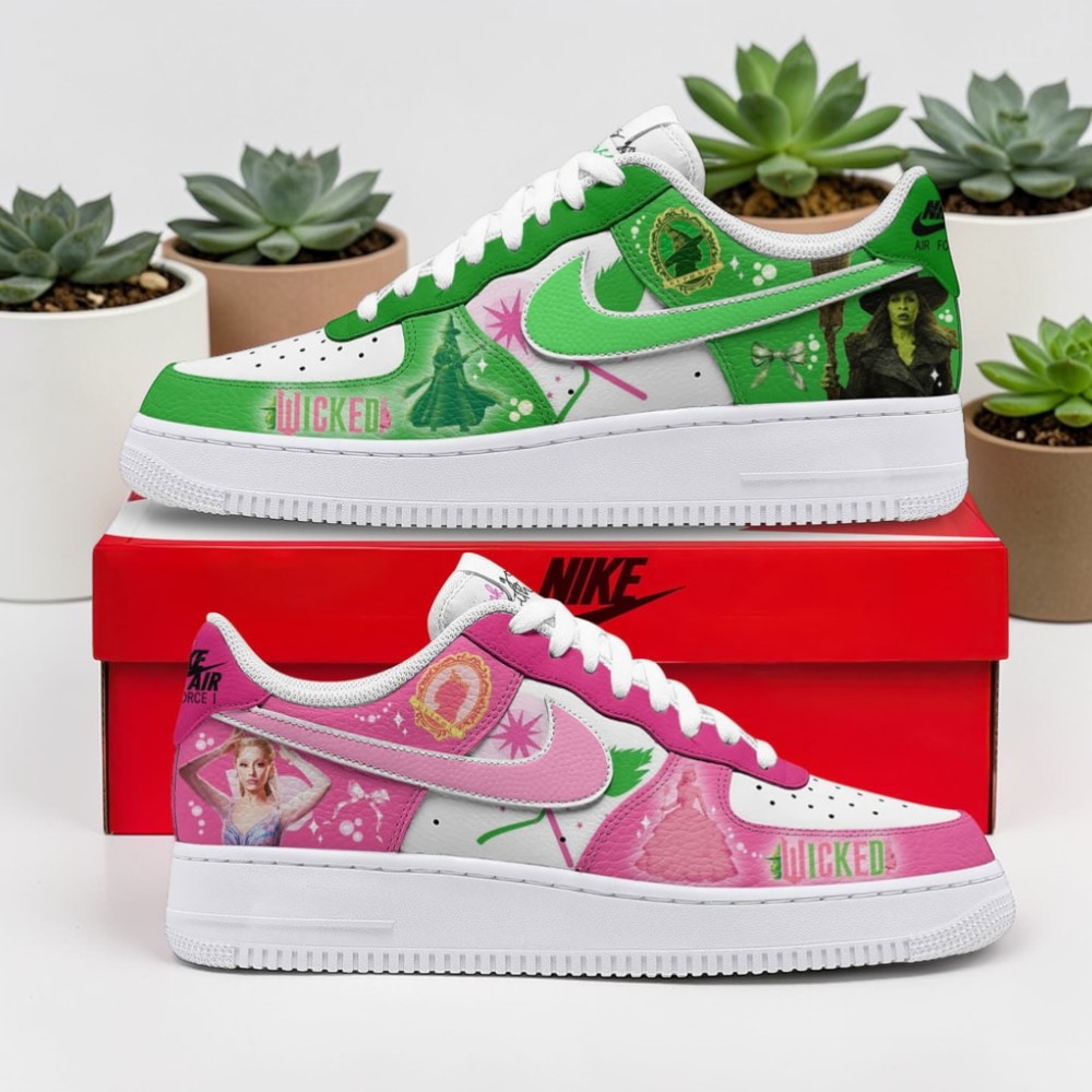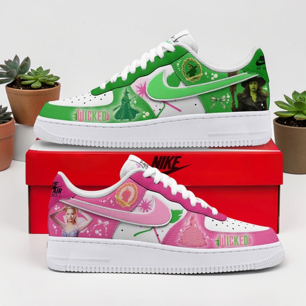 Shades of emerald and blush collide in a bold dance across the silhouette, capturing that unmistakable Wicked energy—the kind that challenges norms and stirs the imagination. Scattered like whispers from the stage, characters and symbols from the musical form a dynamic collage that speaks to rebellion and whimsy all at once. The Nike swoosh slices through the vibrant tapestry, grounding it with familiar swagger while the playful, decorative typography pulses with theatrical flair. These shoes don’t just echo a story—they wear it unapologetically, as if each step is a quiet declaration of individuality. For those who’ve lived for the highs and lows of this beloved musical, the design becomes more than art; it’s an emblem of community, passion, and self-expression. Sneakerheads who appreciate something off the mainstream path will find this pair impossible to overlook, woven with as much attitude as the characters fans adore. Whether worn through streets buzzing with energy or kept as a prized chapter in a collection, the appeal runs deeper than aesthetics. They’re a nod to shared moments, late-night rehearsals of curtain calls, and the unapologetic joy of owning what makes you feel alive. A thoughtful token for anyone who thrives on vibrant stories and bold choices, these shoes invite their wearer to embrace the magic in every step.Wicked The Musical Air Force 1 Shoes
