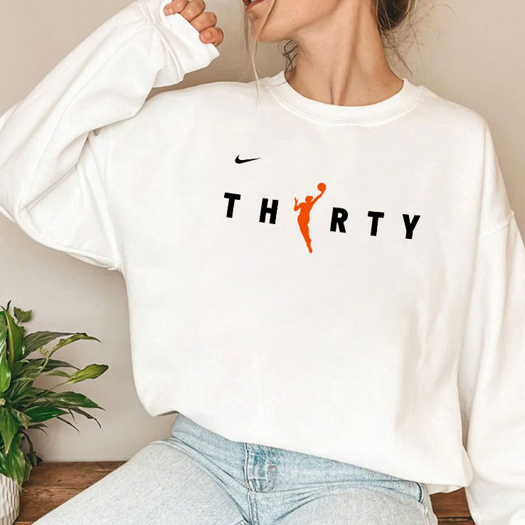 Bold black letters spell out THIRTY, anchored by a bold sans-serif font with just enough spacing to let each character breathe confidently. The standout feature is the orange basketball silhouette, seamlessly integrated as the letter I, creating a striking visual that instantly connects to the sport’s energy and legacy. The clean, minimalist layout keeps the focus sharp, while the swoosh-inspired logo subtly nods to athletic excellence without overpowering the design. This shirt captures more than an anniversary—it symbolizes a milestone etched in basketball culture, a nod to the league’s growth and the fierce spirit of its fans. It's the kind of design that speaks to someone who appreciates sleek, modern sportswear but also wants to declare their pride in WNBA history with quiet confidence. Far from flashy, it carries the weight of celebration in its thoughtful composition and balanced color contrast. Anyone deeply connected to the WNBA, whether a longtime fan, a casual supporter, or someone who admires women’s basketball’s rise, will recognize how the design embodies the league’s distinct personality. It fits effortlessly into everyday moments—from grabbing coffee to heading out for a casual game weekend—making it a considered choice for those who live the culture, not just wear it. The WNBA 30th anniversary shirt honors the past while fitting seamlessly into the rhythm of today’s sportswear.