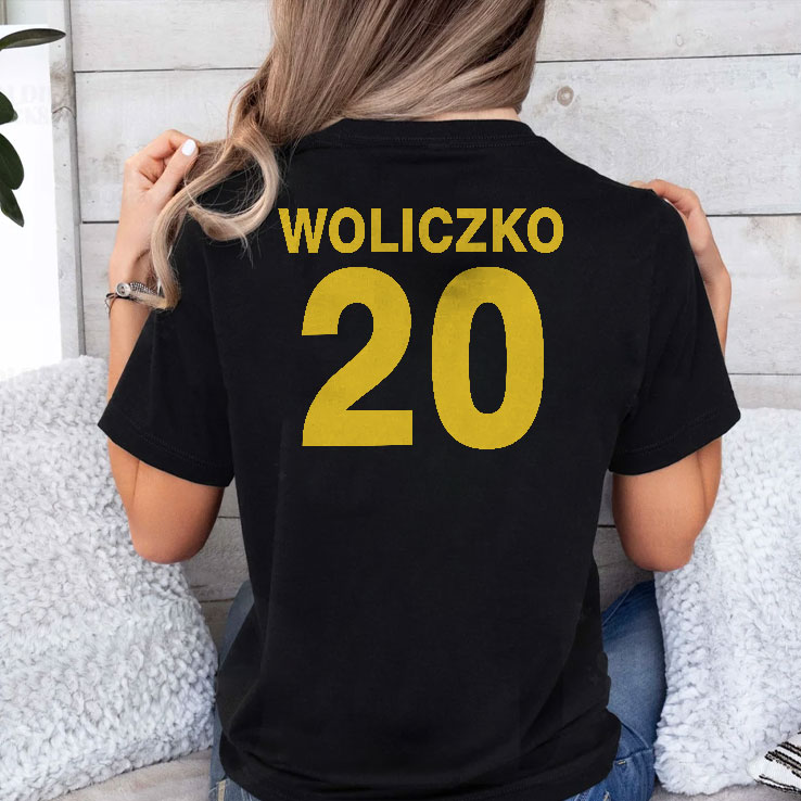 Bright yellow letters pop against a deep black background, immediately drawing eyes to the large block name “WOLICZKO” that stretches across the chest. Below it, confident and playful in equal measure, the phrase “Hard To Say, Harder To Guard” frames the surname with a cheeky vibe. A smaller line beneath breaks down the pronunciation, adding a touch of approachable humor to the bold typography. On the back, a circular inset reveals the number 20, lending a subtle nod to athletic styling without overwhelming the shirt’s standout graphic front. This shirt carries a modern, street-smart energy—clean, sharp lines and high-contrast colors that feel both athletic and effortlessly casual. It’s the kind of piece that someone who embraces their individuality might choose without hesitation, especially if their name connects with the design or if they enjoy wearing something that sparks a smile or a conversation. The boldness isn’t boastful, but self-assured, the humor balancing pride with a wink. Paired simply with dark jeans or joggers, it fits smoothly into everyday wear—something you might pull on heading out with friends or to casual events where a touch of personality is welcome. It’s a natural gift for someone who carries the surname or a nickname tied to it, a statement not just about identity, but about owning that identity with confidence and a bit of fun. The WOLICZKO name here becomes more than just a label; it’s a declaration.