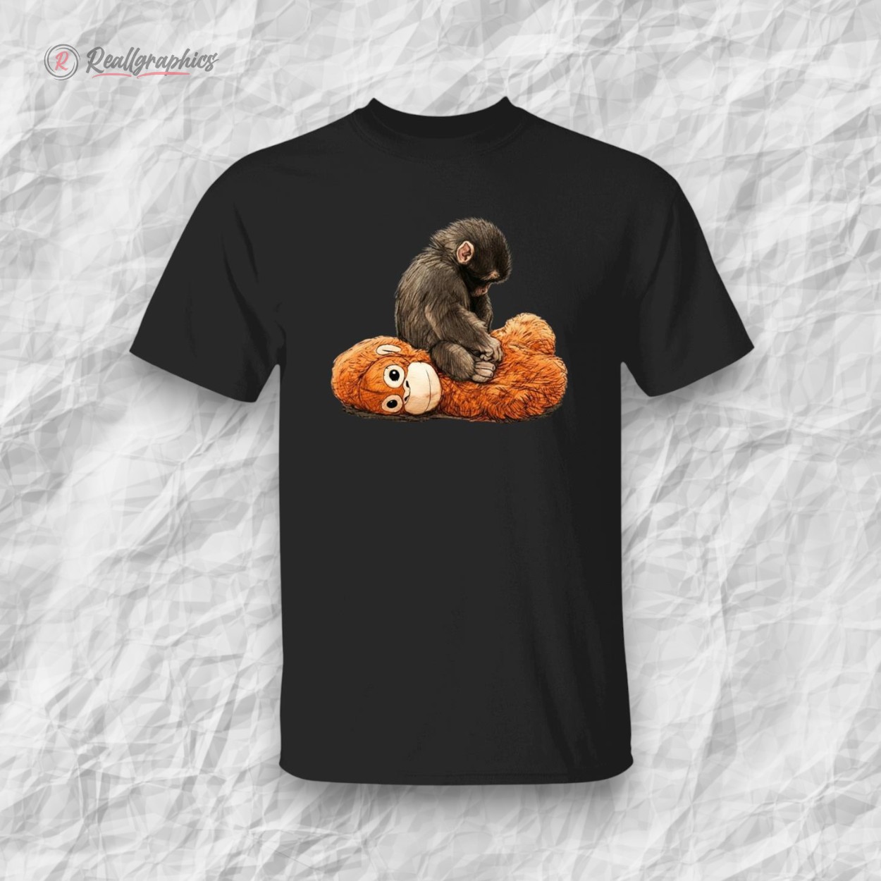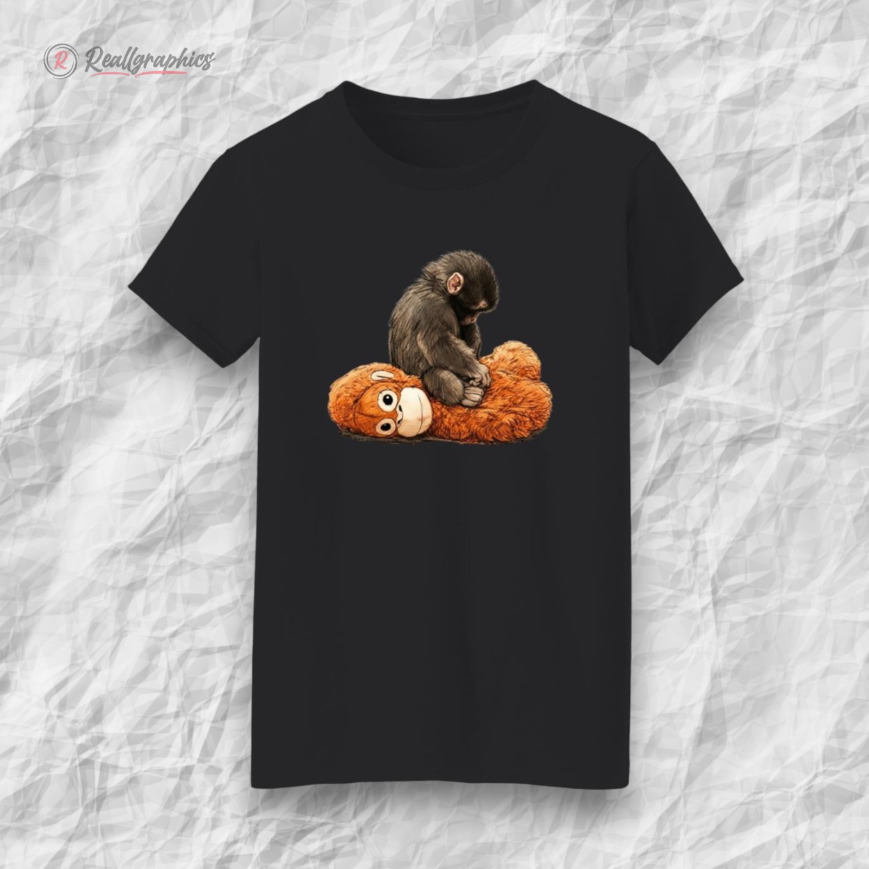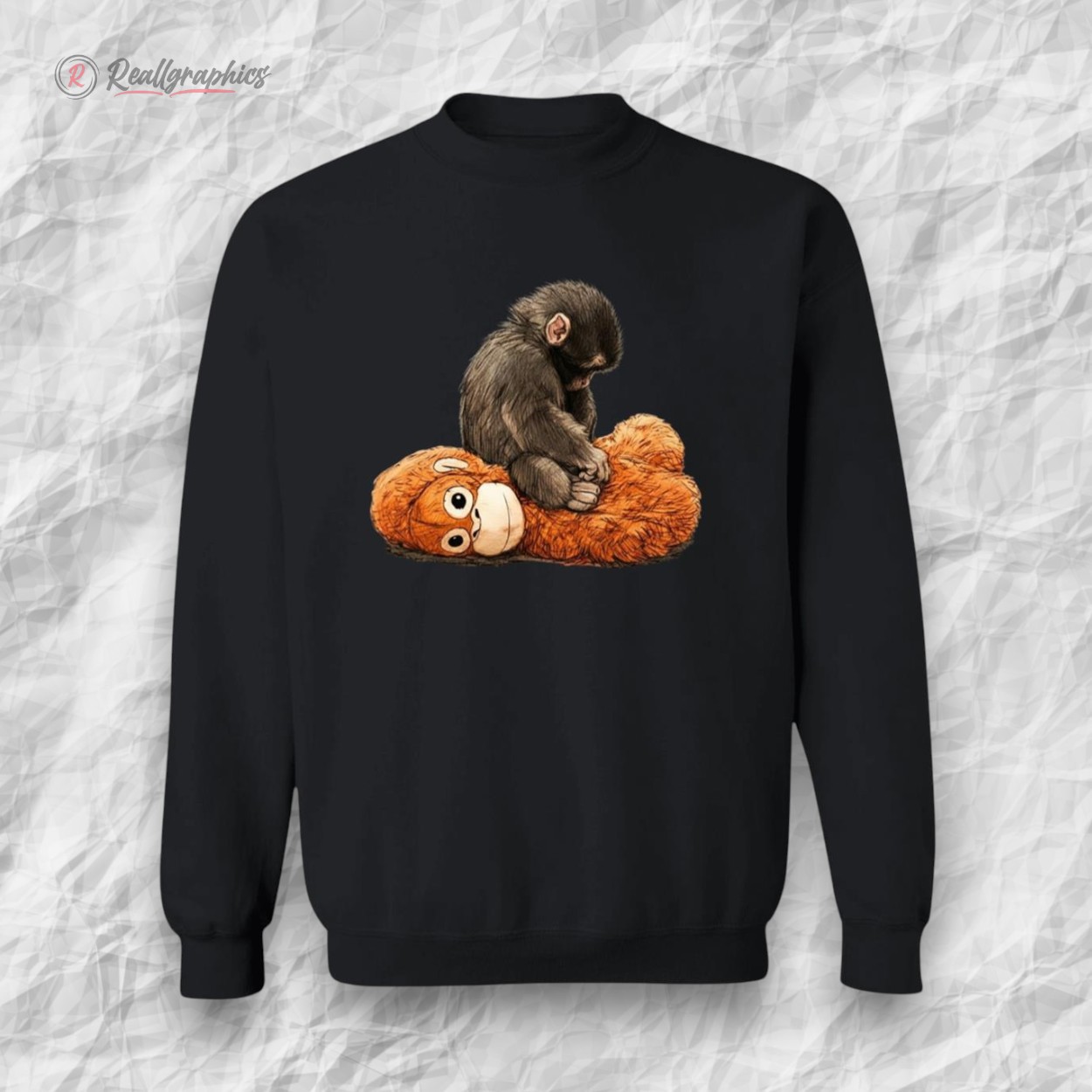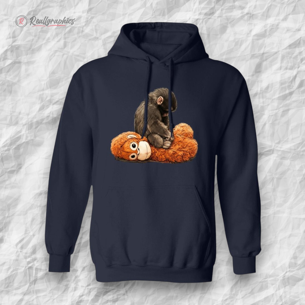 A dark navy hoodie carries a small scene of gentle playfulness—a tiny monkey perched carefully on a plush orange teddy bear. The soft lines and understated colors capture a moment of quiet companionship between two unlikely friends, hinting at a sense of warmth and whimsy that quietly lifts the mood. It’s a design that speaks to those who appreciate subtle humor and charm layered beneath everyday comfort. For women and teens who find joy in the little oddities of life, this monkey plush hoodie resonates as more than just a piece of clothing. It becomes a way to wear personality without saying a word. The illustration isn’t just cute; it’s a quiet nod to anyone who values soft moments of lightheartedness amid routine, or who enjoys a playful contrast between childhood nostalgia and grown-up ease. It fits naturally into casual outings or relaxed days when comfort is key, marrying cozy fabric with an image that feels both familiar and imaginative. Those who collect or cherish unique animal-themed graphics will likely connect to the quirky charm, making it an easy choice for gifting to friends who delight in thoughtful, whimsical details. This sweatshirt embodies a gentle, playful spirit that stands out not through loud statements, but through a shared affection for simple, sweet creativity.