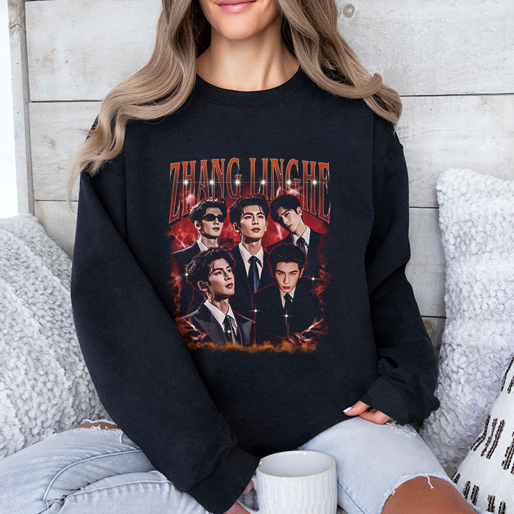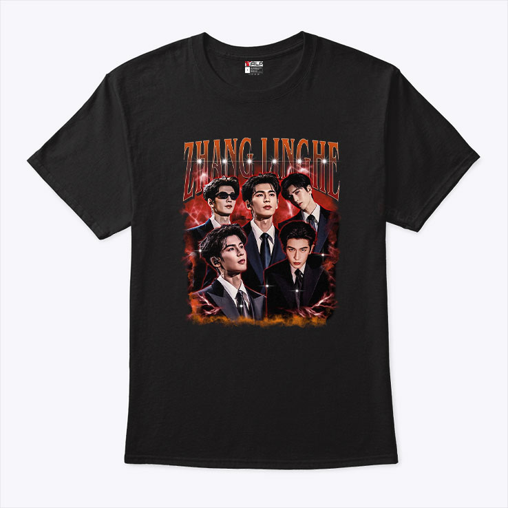 A sharply illustrated group portrait anchors the center of this shirt, showcasing Zhang Linghe alongside fellow actors, all clad in sleek suits that speak to a cinematic elegance. The deep, almost inky background makes the fiery red and orange accents burst to life, creating a striking contrast that captivates without overwhelming. Above, the name ZHANG LINGHE stands out in bold serif typography, embossed with a distressed texture that lends a tactile sense of grit and drama, echoing the intense narratives C-drama fans know well. The composition feels deliberate yet dynamic, as if frozen from a climactic scene — it’s not just a fan shirt, but a nod to the storytelling and style that define Zhang Linghe's work. The visual interplay between the characters' poised stances and the shirt’s warm hues draws the eye around the design, rewarding repeated glances. It’s a graphic tribute that resonates deeply with those who appreciate the nuanced performances and vivid worlds found in contemporary Chinese drama. Anyone closely following Zhang Linghe’s career or invested in C-drama culture would sense this is more than apparel—it’s a wearable expression of admiration and connection. Ideal for casual days when merging fandom with everyday life feels right, or quietly sharing one’s interests at informal gatherings, this Zhang Linghe shirt balances style and substance with thoughtful design craftsmanship.Zhang Linghe C-Drama Actor Shirt